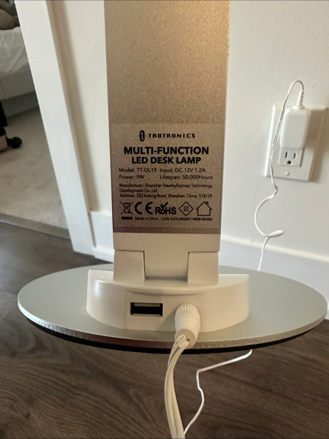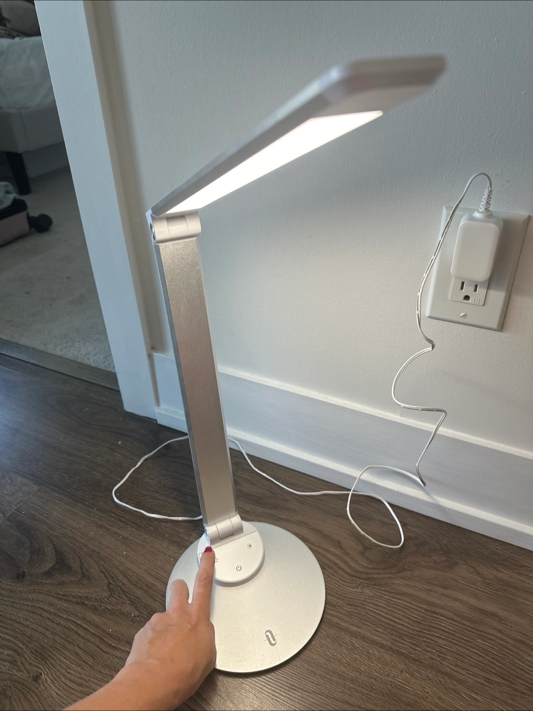 Taotronics desk lamp. Adjustable angle. Adjustable light warmth (4 settings from most yellow to most white) and adjustable brightness (4 levels) & built in USB power source