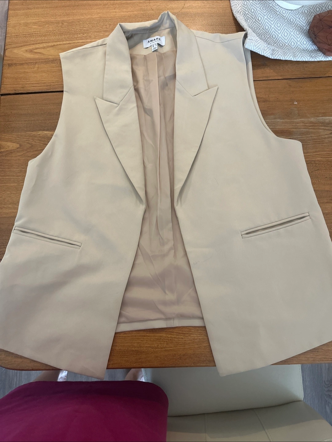 Selling an Aware by Vero Moda vest in a neutral beige colour. It's a women's size US 8 (EU 40, UK 12). This stylish vest is perfect for layering and adding a touch of sophistication to any outfit!