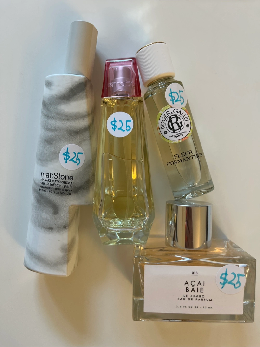 Selling a few different perfumes, each priced at $25: - Masaki Matsushima mat; Stone eau de toilette 90%, 80ml (lid was broken and glued back together) - smalto fullchoke femme edp 90%, 50ml - Roger & Gallet Fleur D'Osmanthus 90%, 30ml - Acai Baie Le Jumbo eau de parfum like new, 75ml