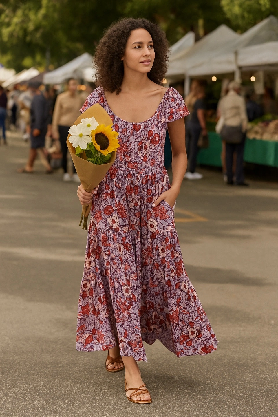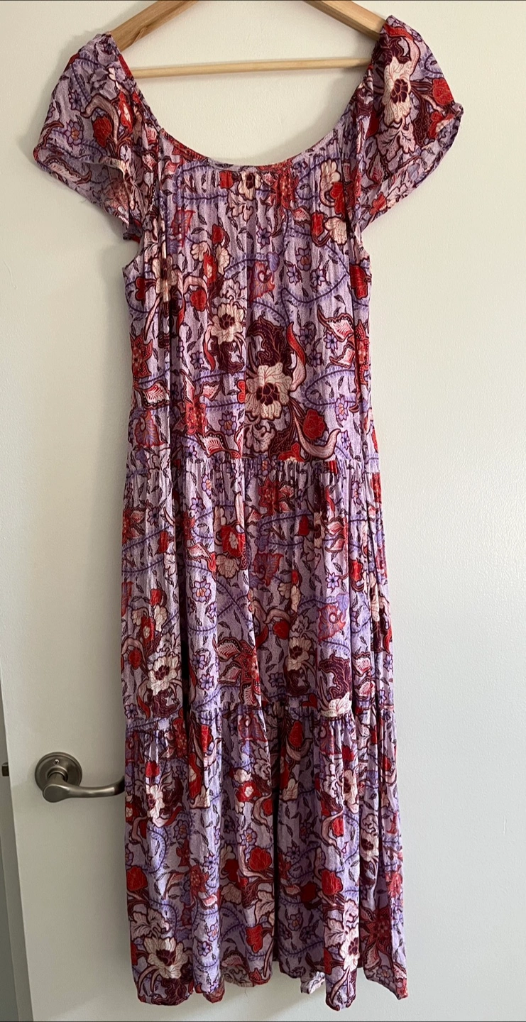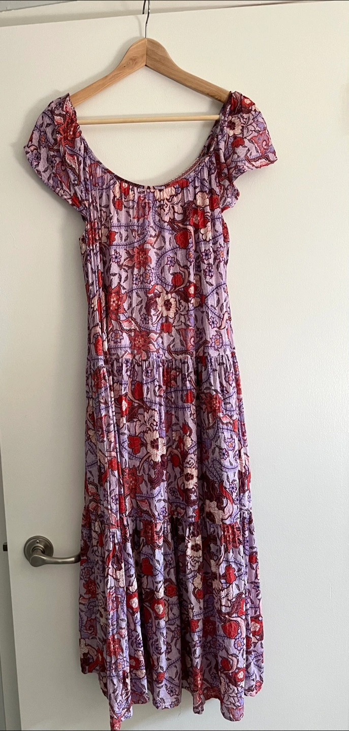 A cute Knox Rose dress in a floral print! It's a maxi. Low waisted and tiered with side pockets 100% Rayon Model image was generated by ChatGPT and not the actual item for sale.