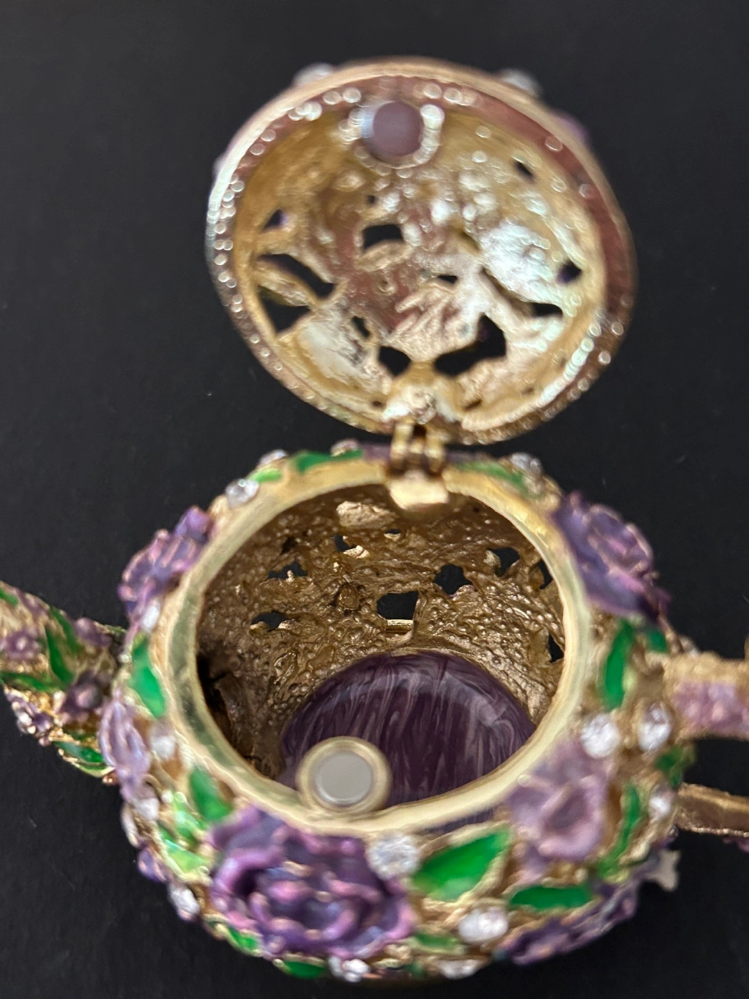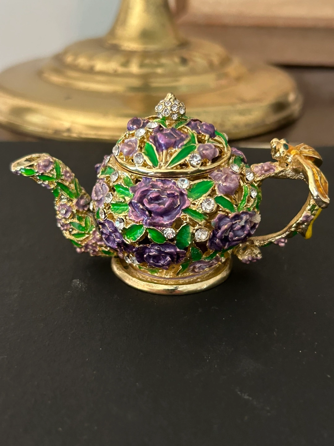 Hand Painted Teapot Trinket Box, Hinged Enameled Jewelry Box pill tea pot Donlands O'Connor Try pretty tea pot with lovely dragonfly handle Hand painted enamels Lid opens up 3.81 x 6.6 x 5 cm; 81.65 g Small delicate size Easy to display 25.00 Can meet at local subway stop Or Flexible re pickup Elmsdale Road M4J 3M3 Donlands O'Connor East York Don Mills south exit off DVP