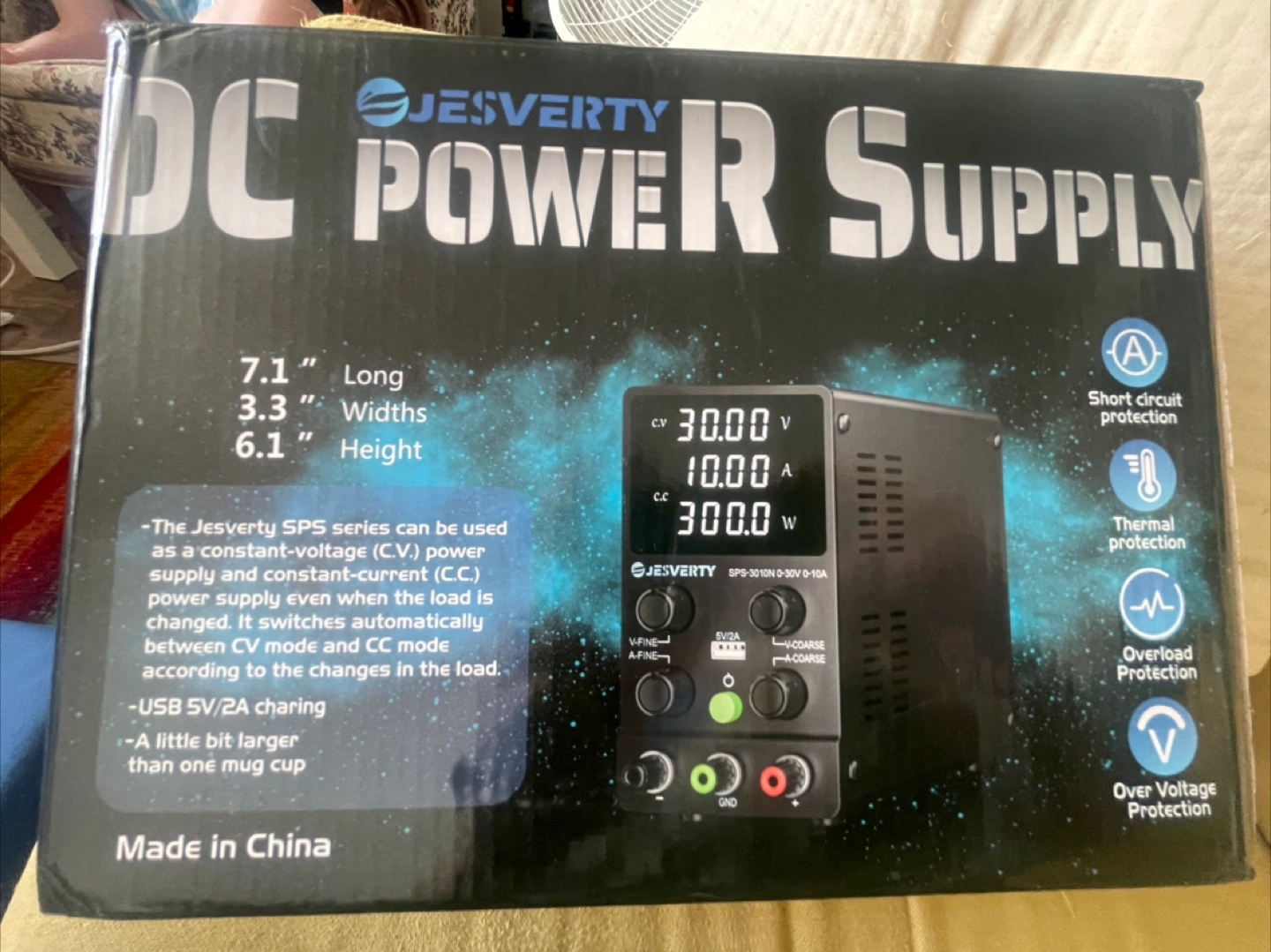 Selling a Jesverty DC Power Supply SPS-3010N. Key features include: - Can be used as a constant-voltage (C.V.) power supply and constant-current (C.C.) power supply, even when the load is changed - Automatically switches between CV mode and CC mode according to changes in the load - USB 5V/2A charging - Short circuit protection - Thermal protection - Overload protection - Over voltage protection Dimensions: - Length: 7.1" - Width: 3.3" - Height: 6.1"