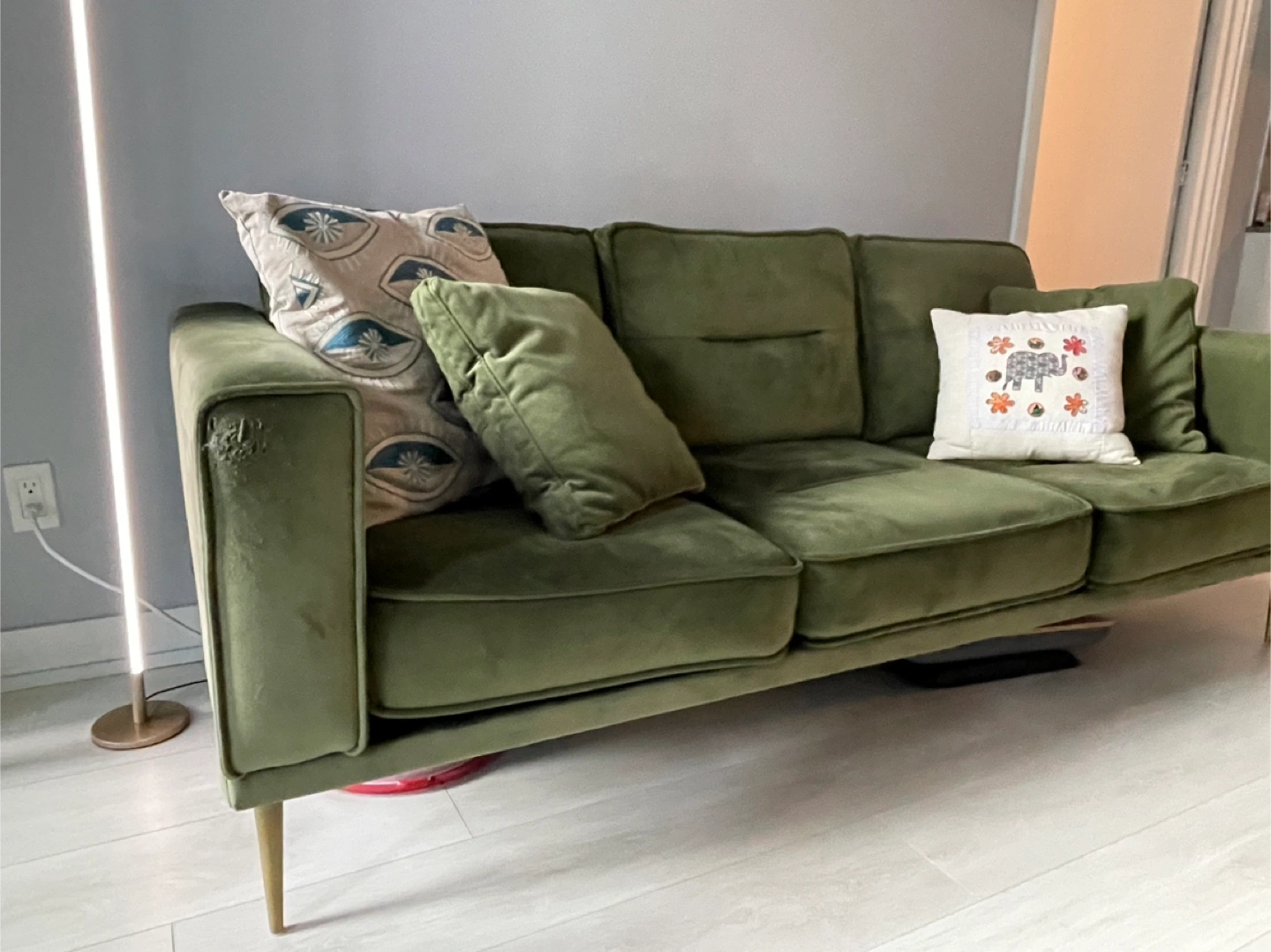 Selling a comfy green velvet sofa. It's in great condition and would look great in any living room! There's a small tear on the armrest. It's a three seater. ๐ Available for pick up In convenient liberty village location! ๐ Moving sale-check out my other postings! Open for negotiations if you want to purchase multiple items! ๐