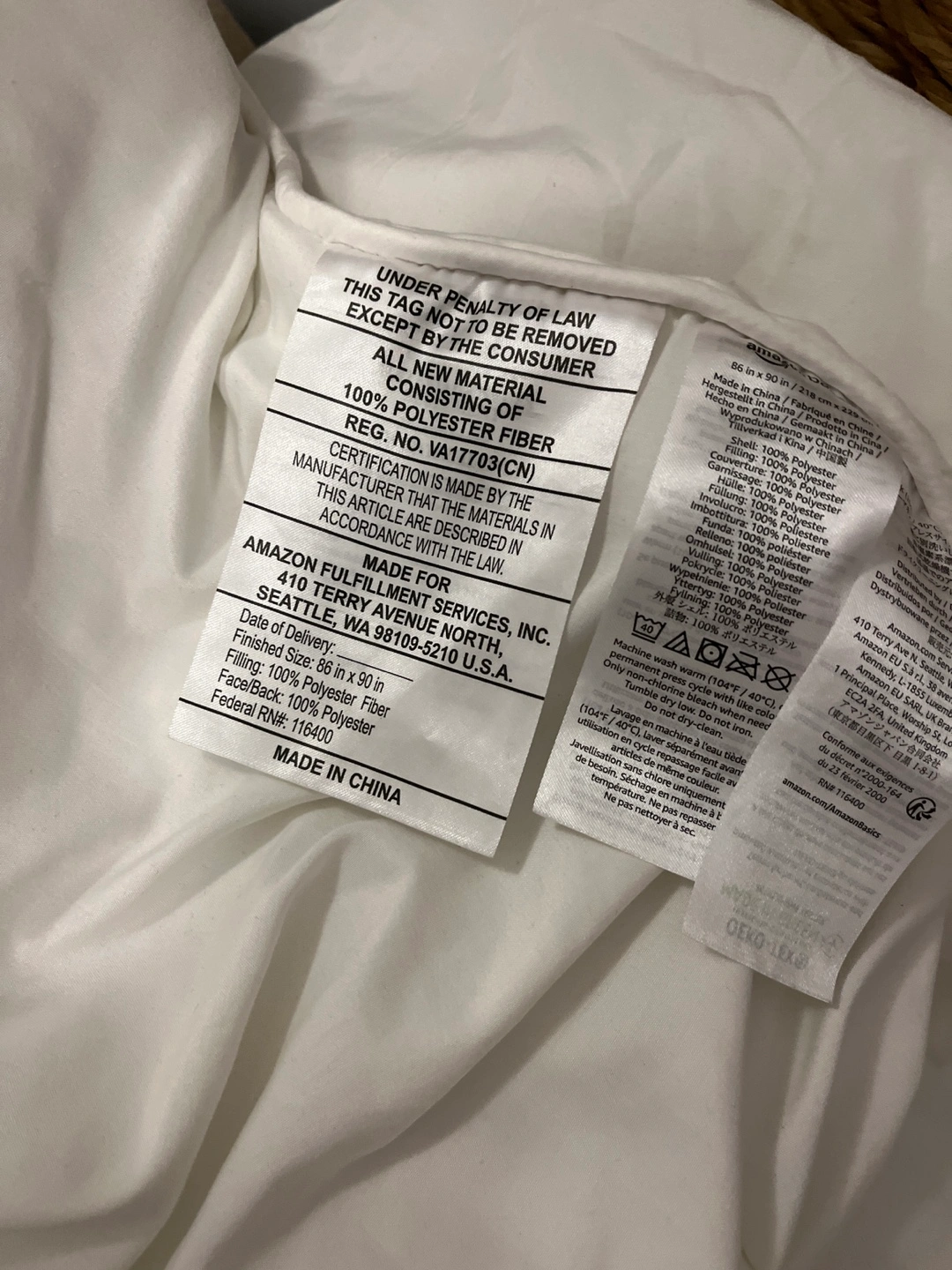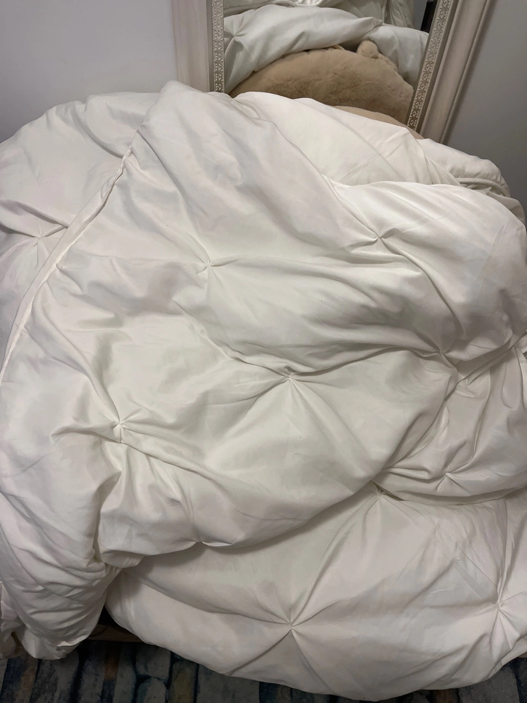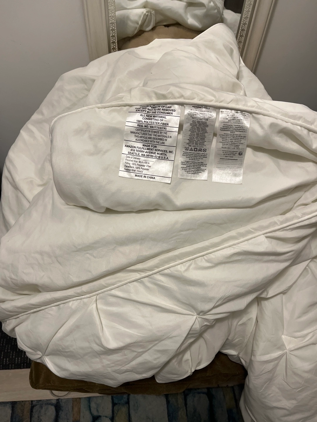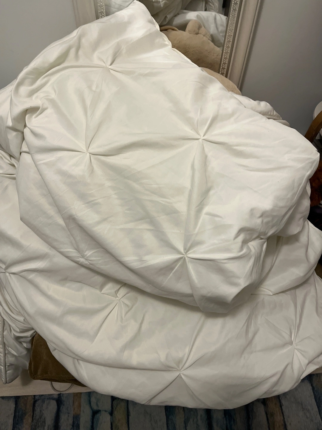Selling a white comforter made of 100% polyester fiber. It's in great condition and measures 86 inches by 90 inches