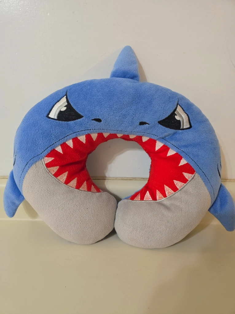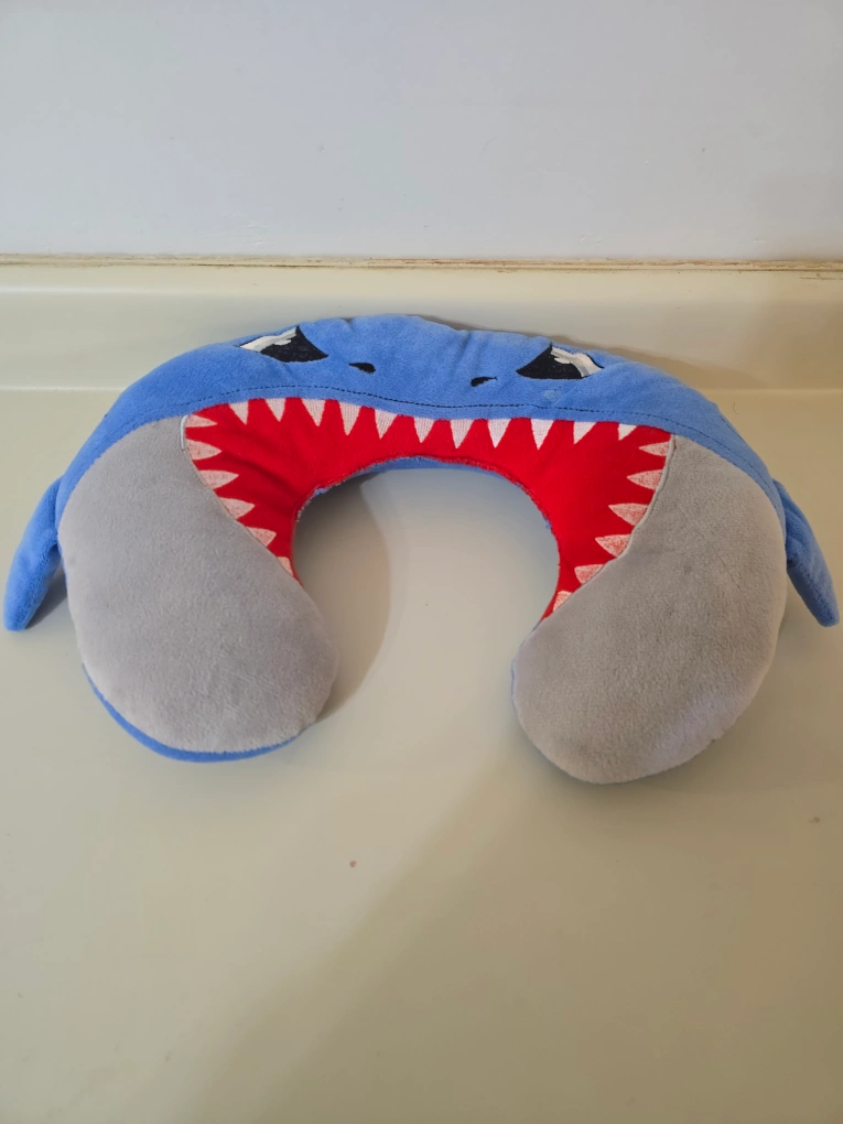 Cute shark-themed neck pillow in blue and grey! Perfect for travel or just relaxing at home. It's in great condition and ready for a new owner!
