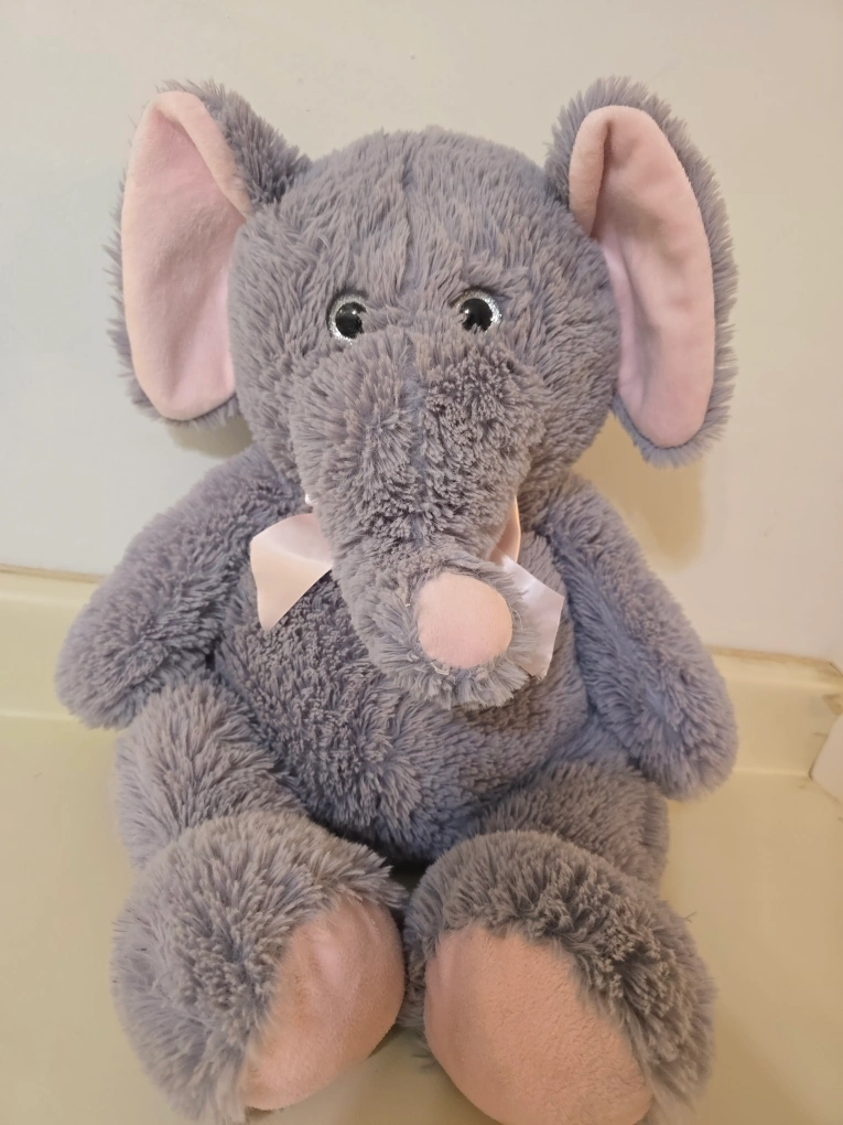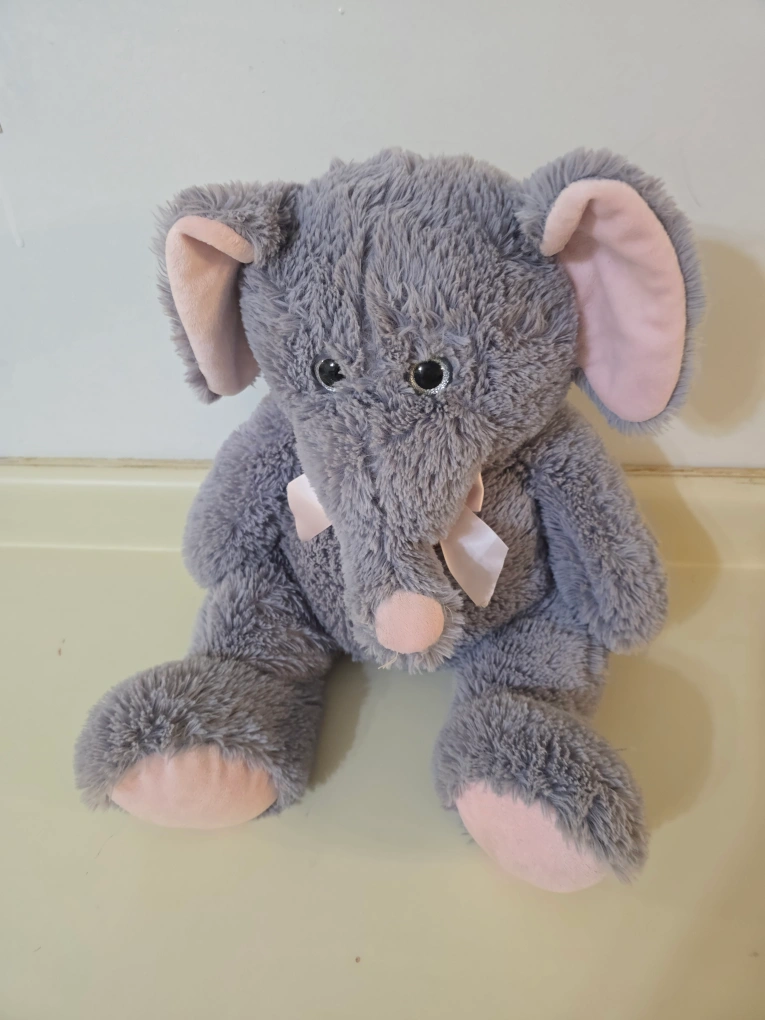 A cuddly grey elephant plush toy with pink accents! It's in great shape and looking for a new home. Perfect for kids or anyone who loves a soft, huggable friend