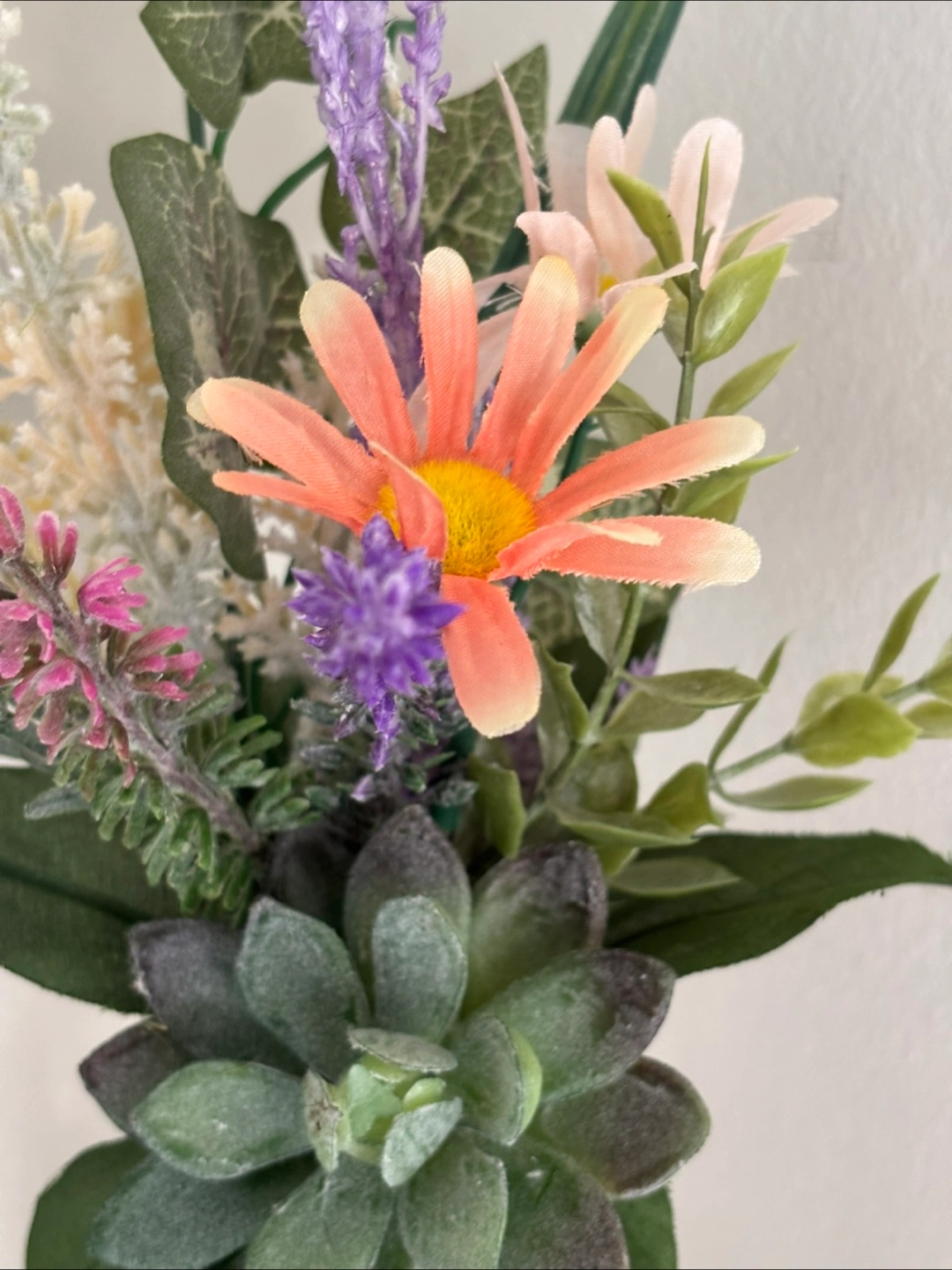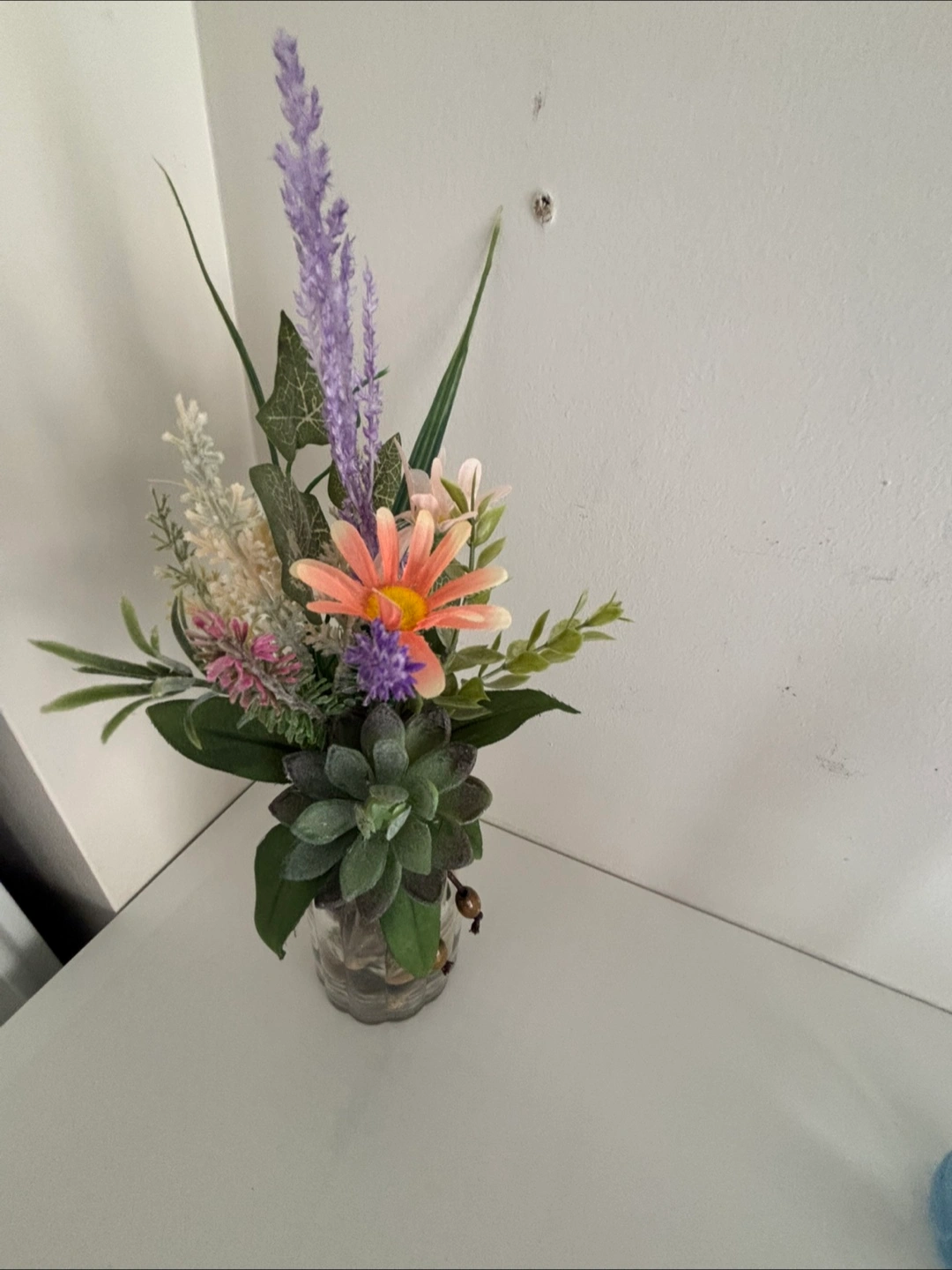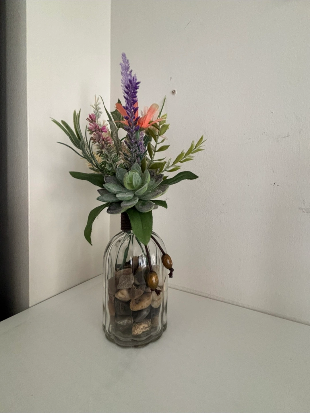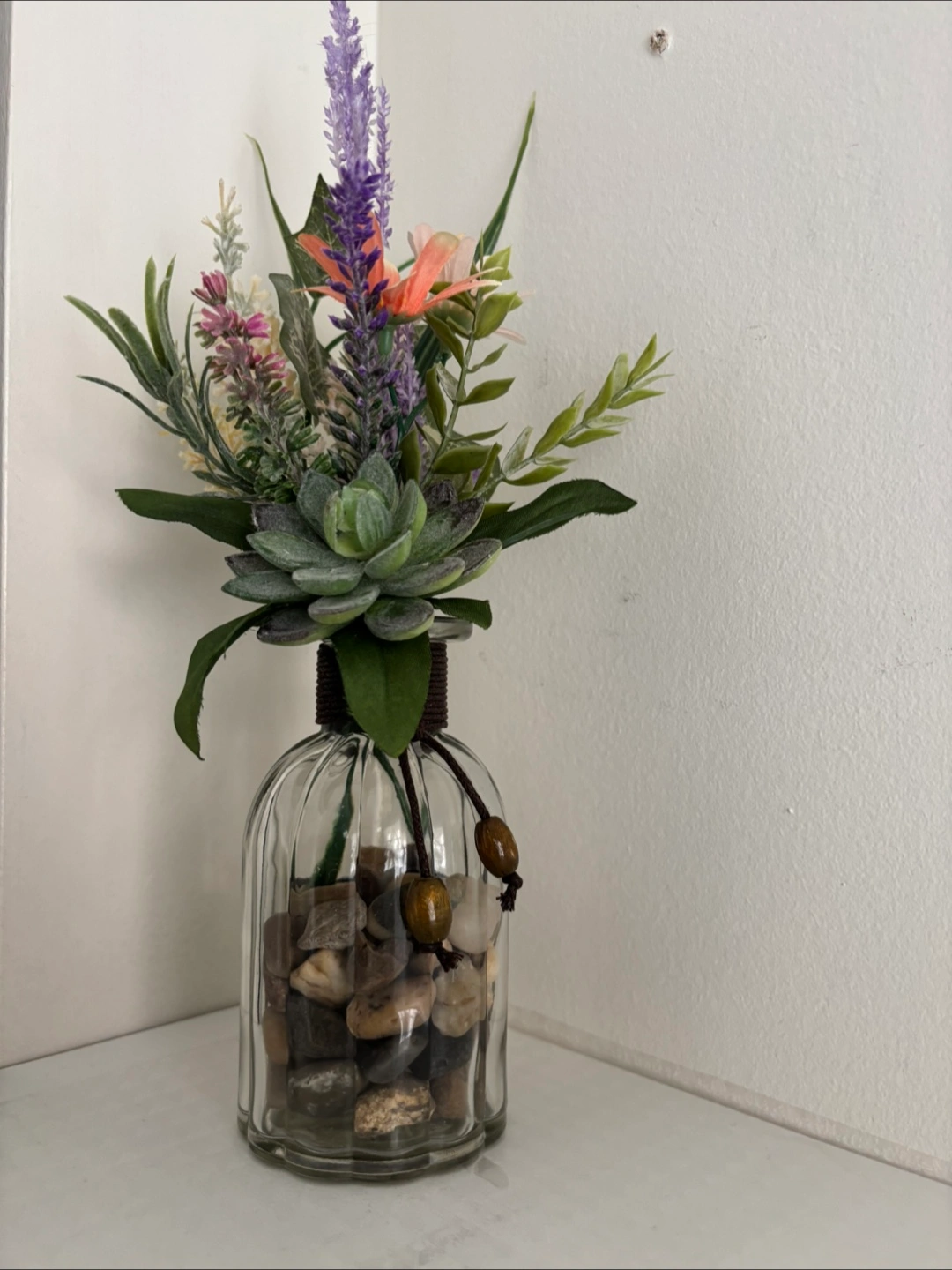 a lovely artificial floral arrangement in a glass vase filled with decorative stones. It features a variety of flowers and greenery, including a succulent, lavender, and peach-coloured daisy. This would be a charming addition to any room! Home decor Pickup in Mississauga