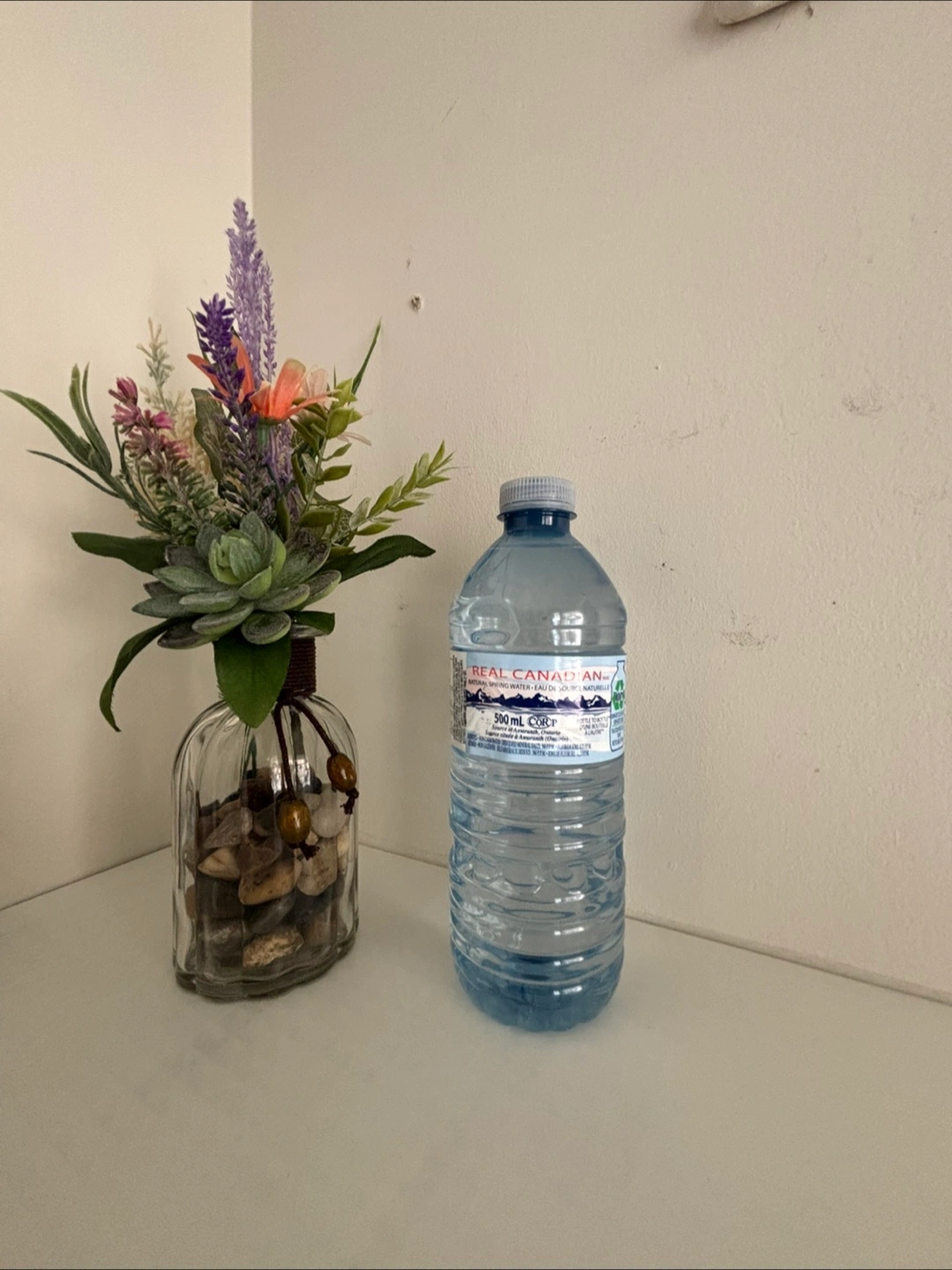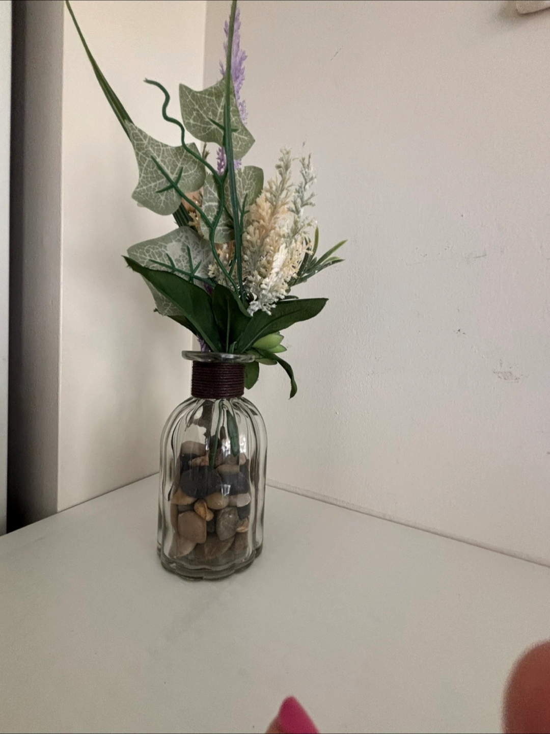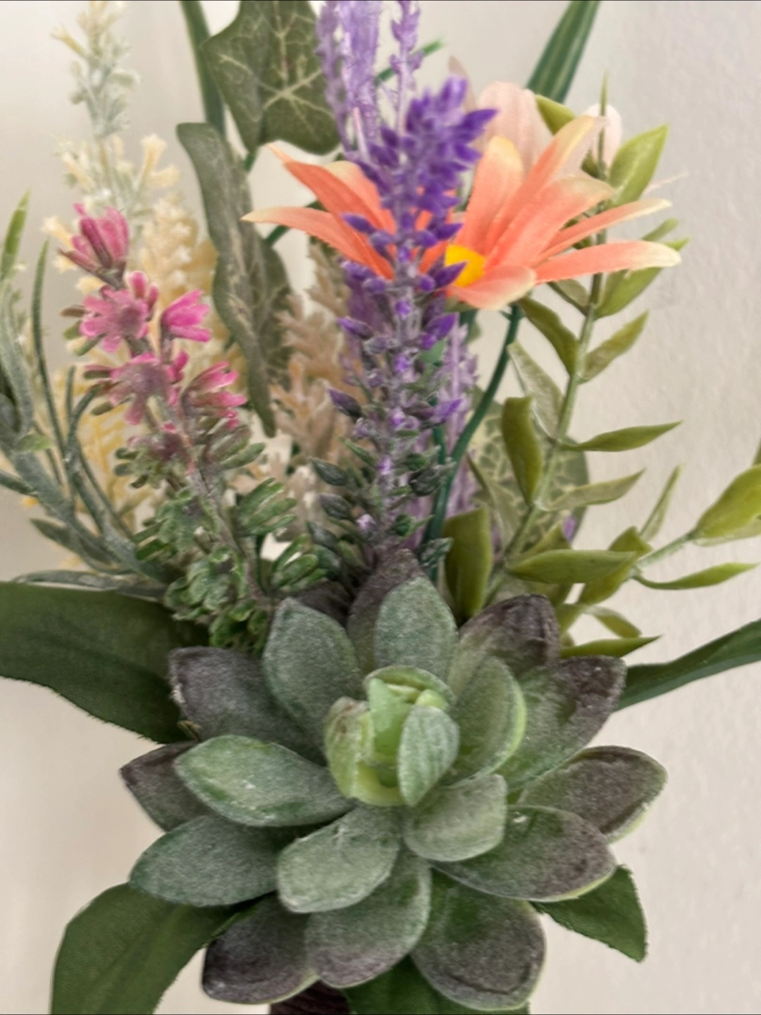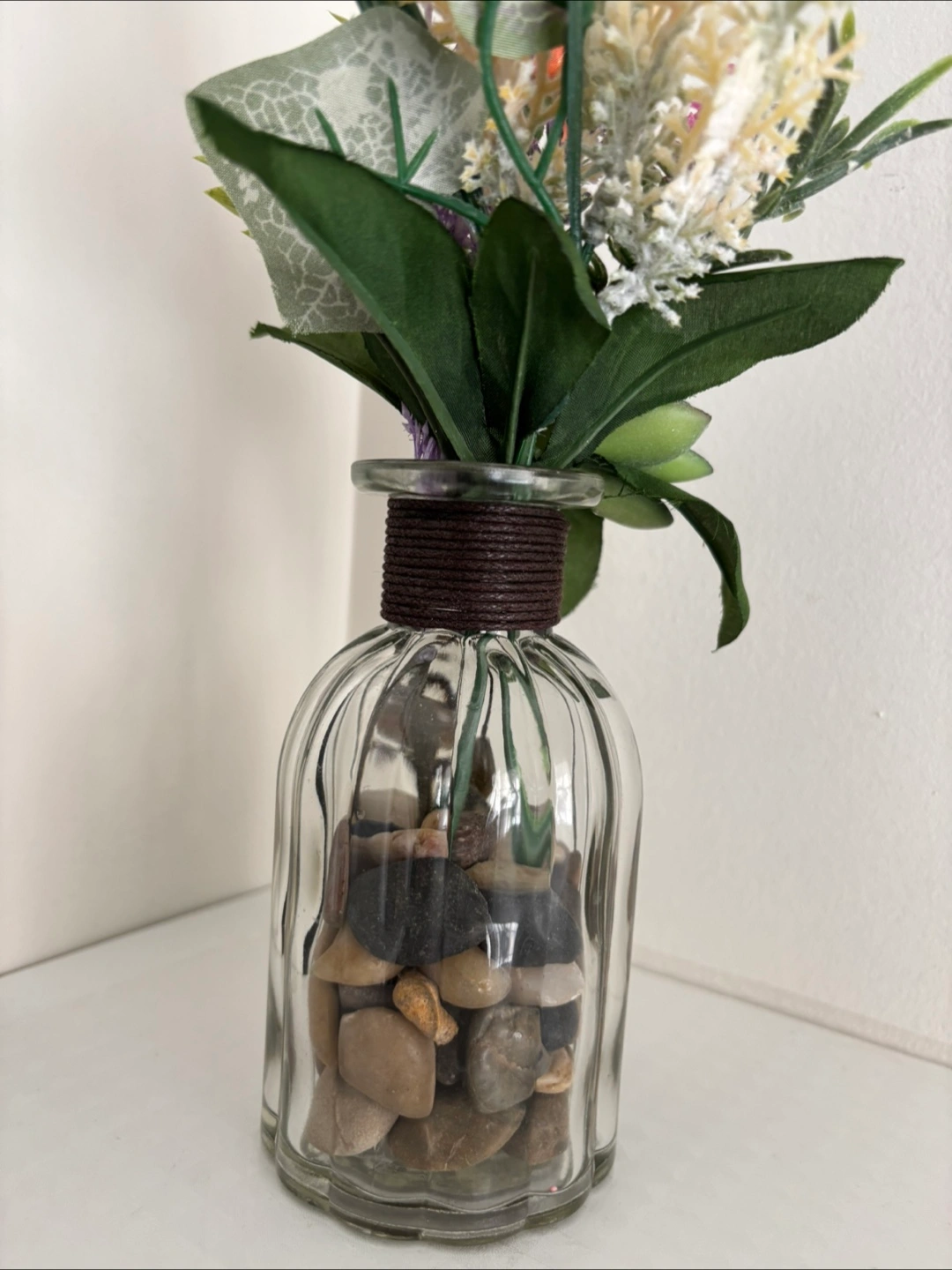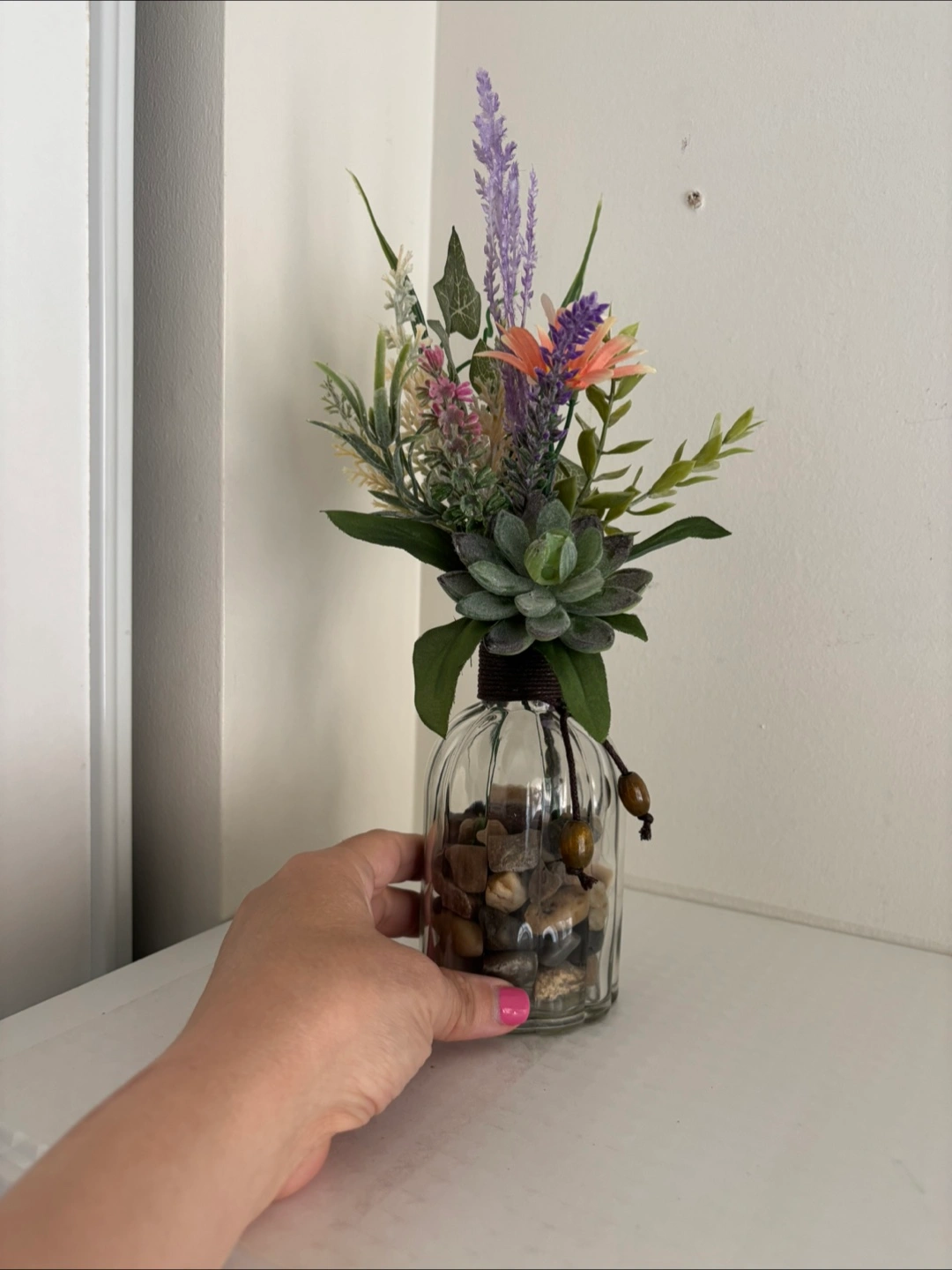 a lovely artificial floral arrangement in a glass vase filled with decorative stones. It features a variety of flowers and greenery, including a succulent, lavender, and peach-coloured daisy. This would be a charming addition to any room! Home decor Pickup in Mississauga