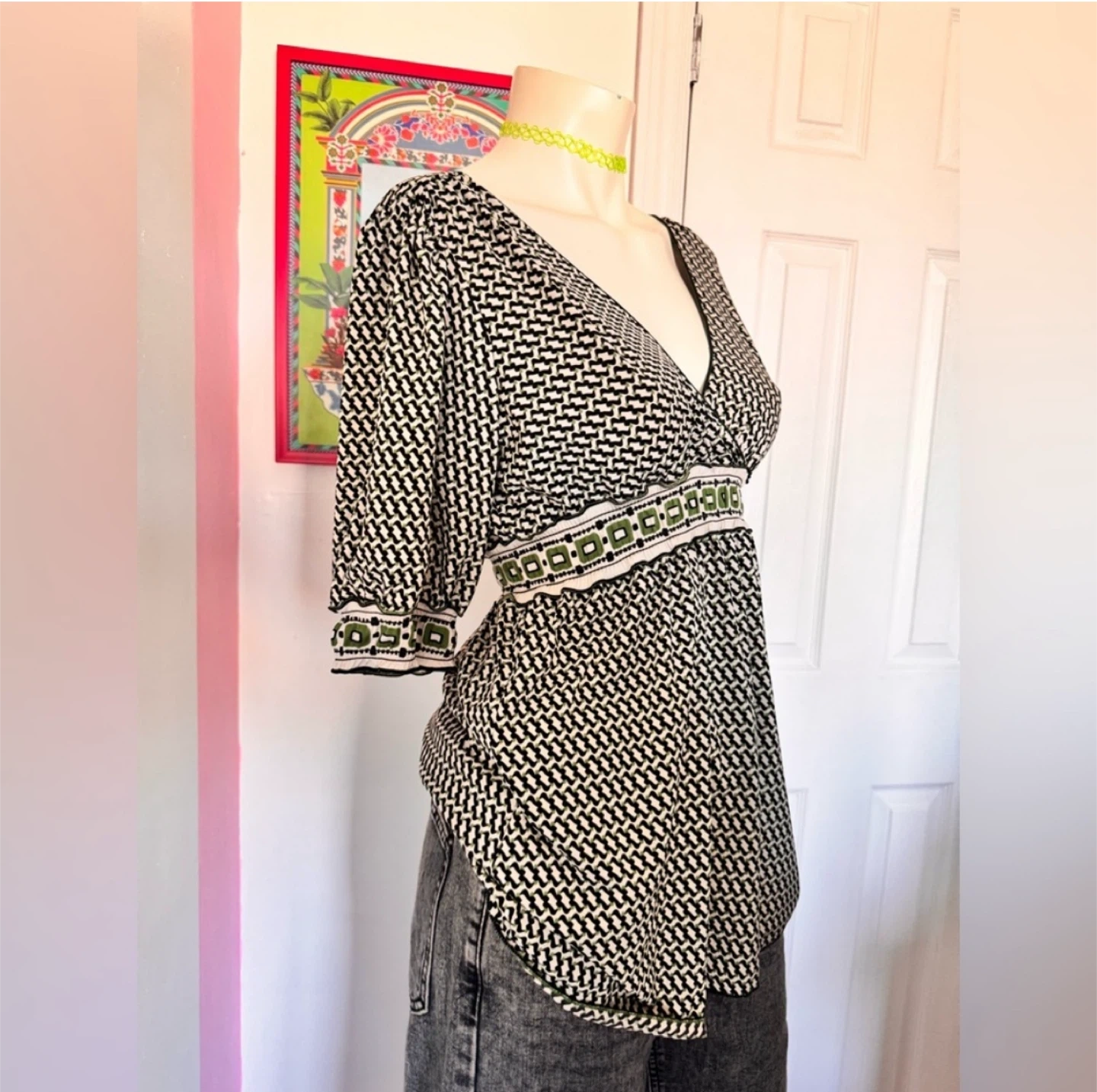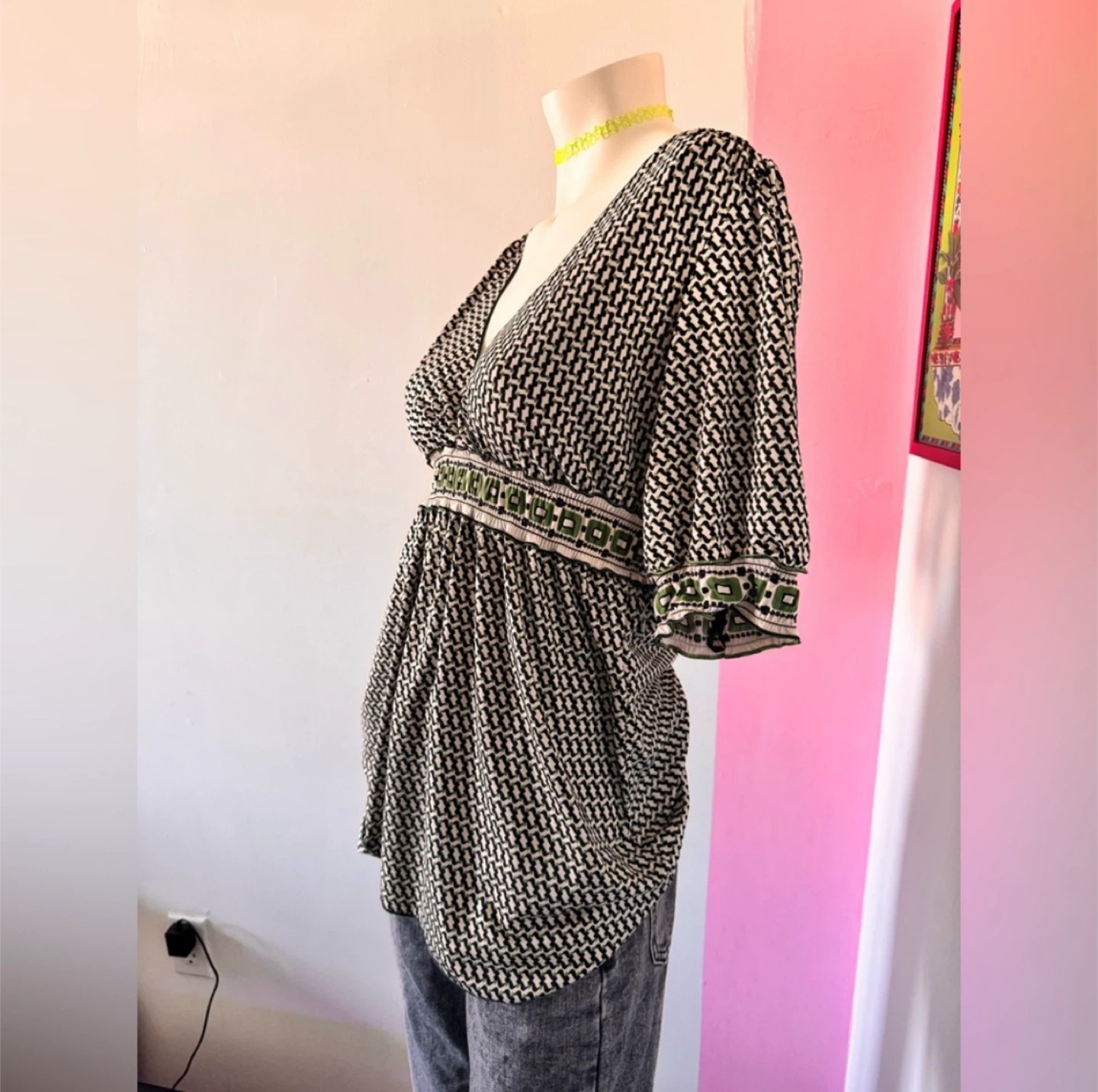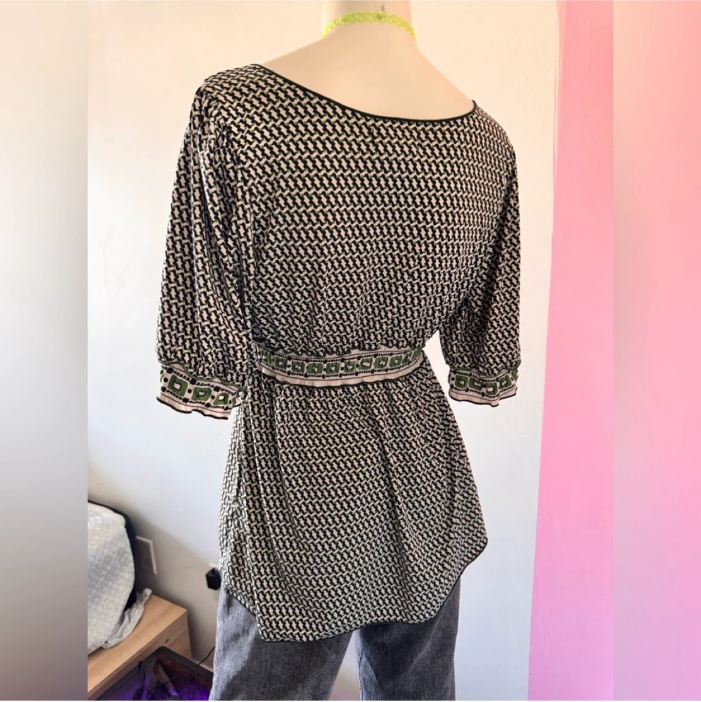 Brand: M.S.S.P (max studio specialty products) Size: M Measurements: Length: 28” Pit-to-Pit: 15” Shoulder Width: 11” Sleeve Length: 12” Hem Length: 23” Sleeve Cuff Length: 6” Neckline Depth: 9” Vcut Neck Length: 10” x 2 Waist Band: 12” x 2” Material: Polyester, Spandex Condition: EUC