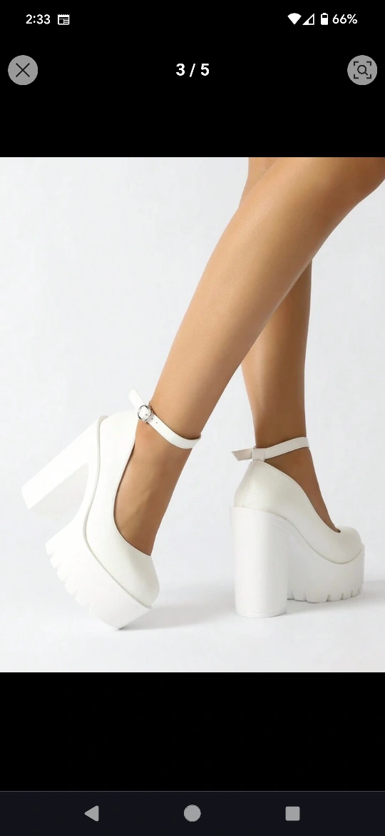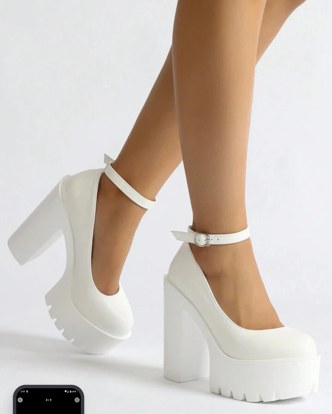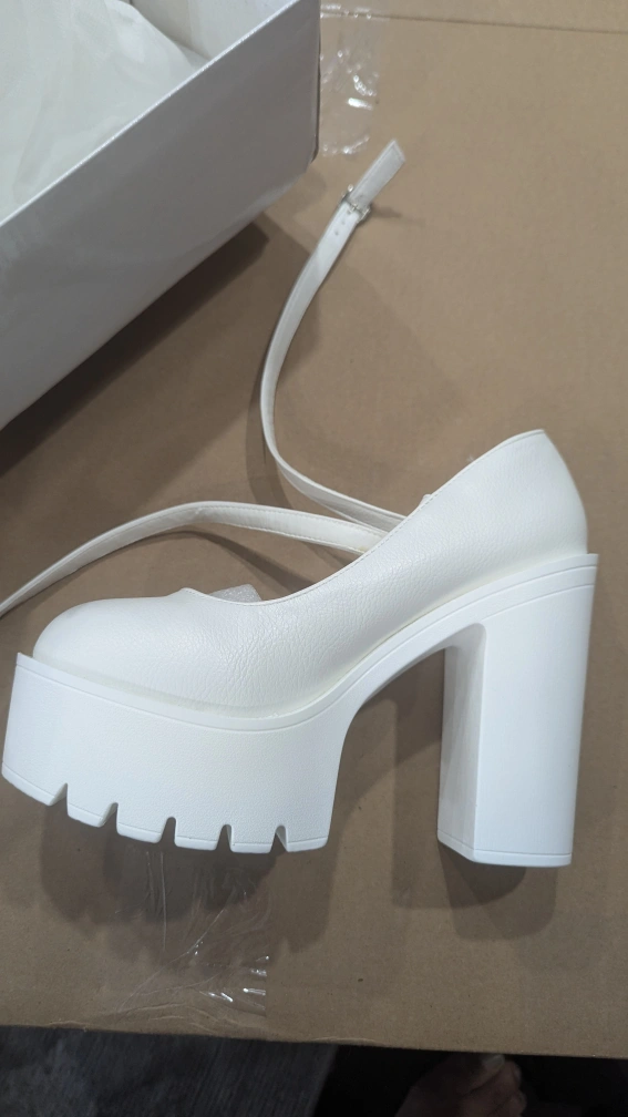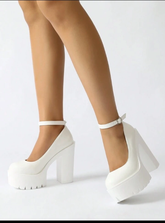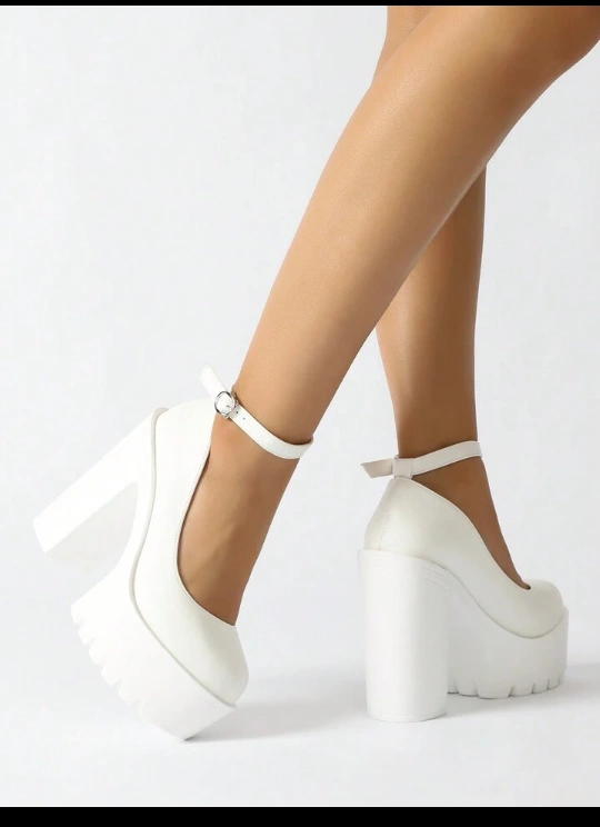 These are some super cute white platform heels! They have an ankle strap and a chunky heel. Perfect for a night out or a special occasion
