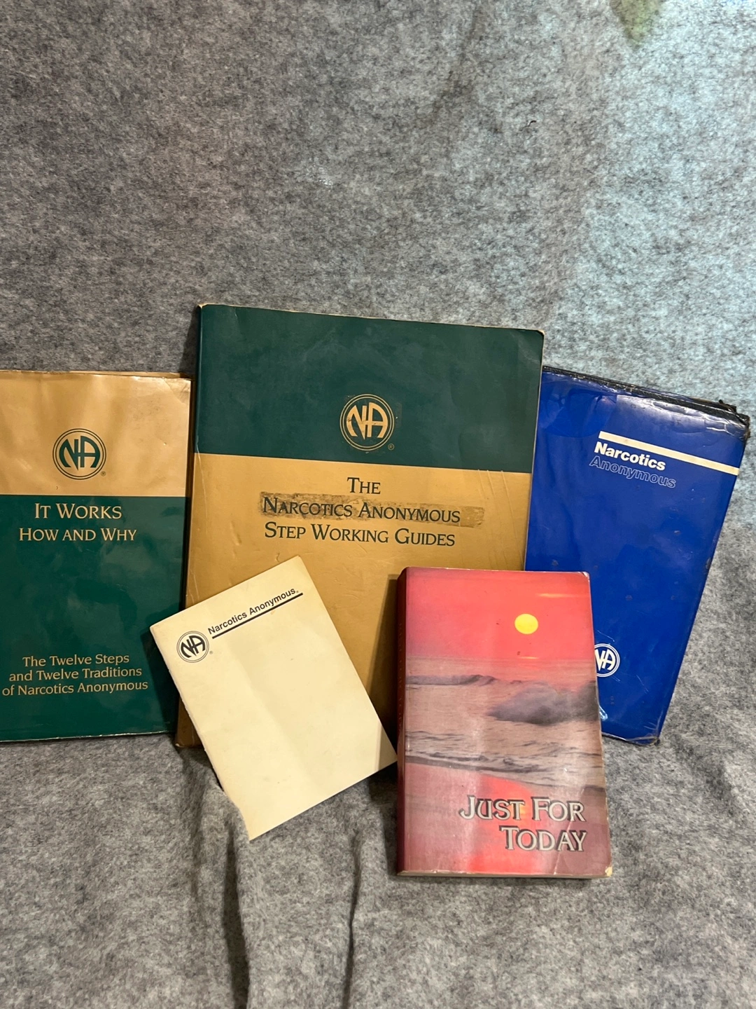 Selling a collection of Narcotics Anonymous books. Includes titles like 'It Works How and Why', 'The Narcotics Anonymous Step Working Guides', and 'Just For Today'. Great resource for anyone interested in the twelve steps and traditions of Narcotics Anonymous