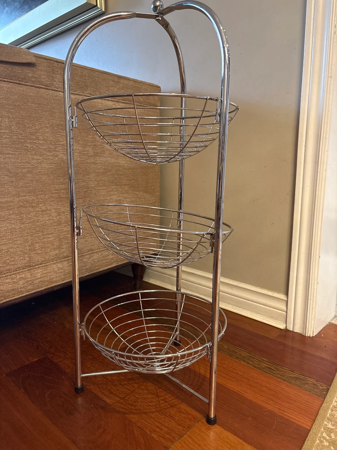 Selling a handy 3-tier metal wire basket stand! It's perfect for organizing fruits and veggies in the kitchen or pantry. The stand is in great condition and ready to find a new home. It's a great space saver!