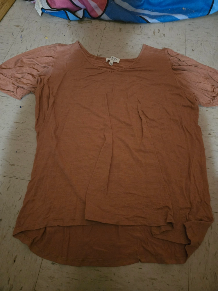 Here's a Style & Co. top in a lovely brown colour! It's a size large and has short, slightly puffed sleeves. Perfect for a casual day out or a comfy day at home