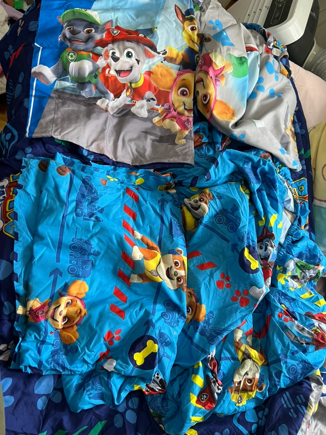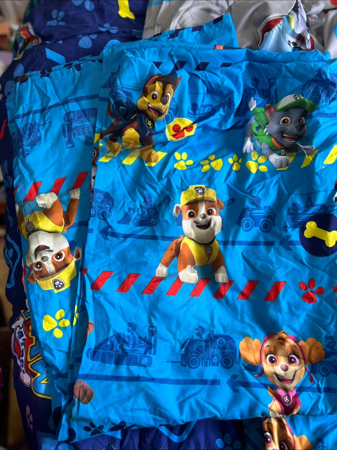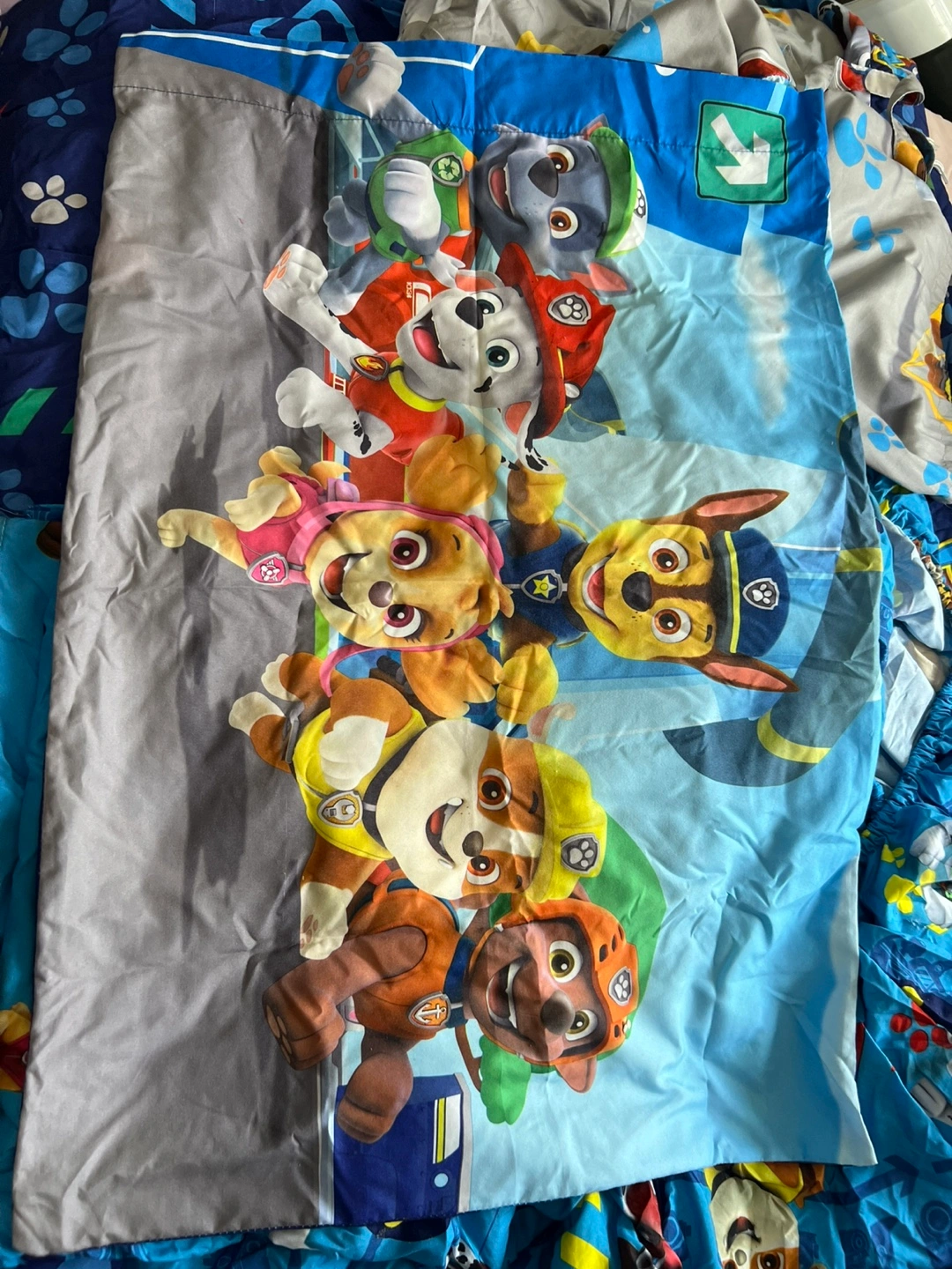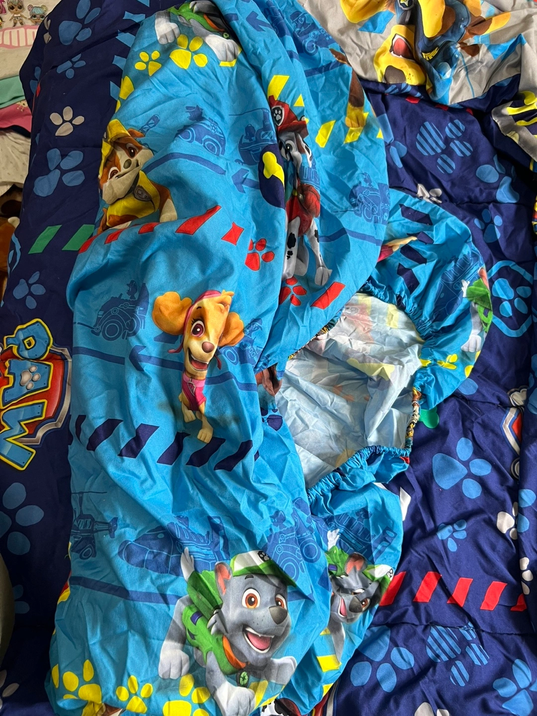 Paw Patrol bedding set featuring the characters from the popular kids' show! Includes a pillowcase and a comforter cover. Comes with Bag Duvet 1-double sided pillowcase Bed sheet cover Flat sheet Pick up only Located near Mt. Pleasant and Eglinton Ave East