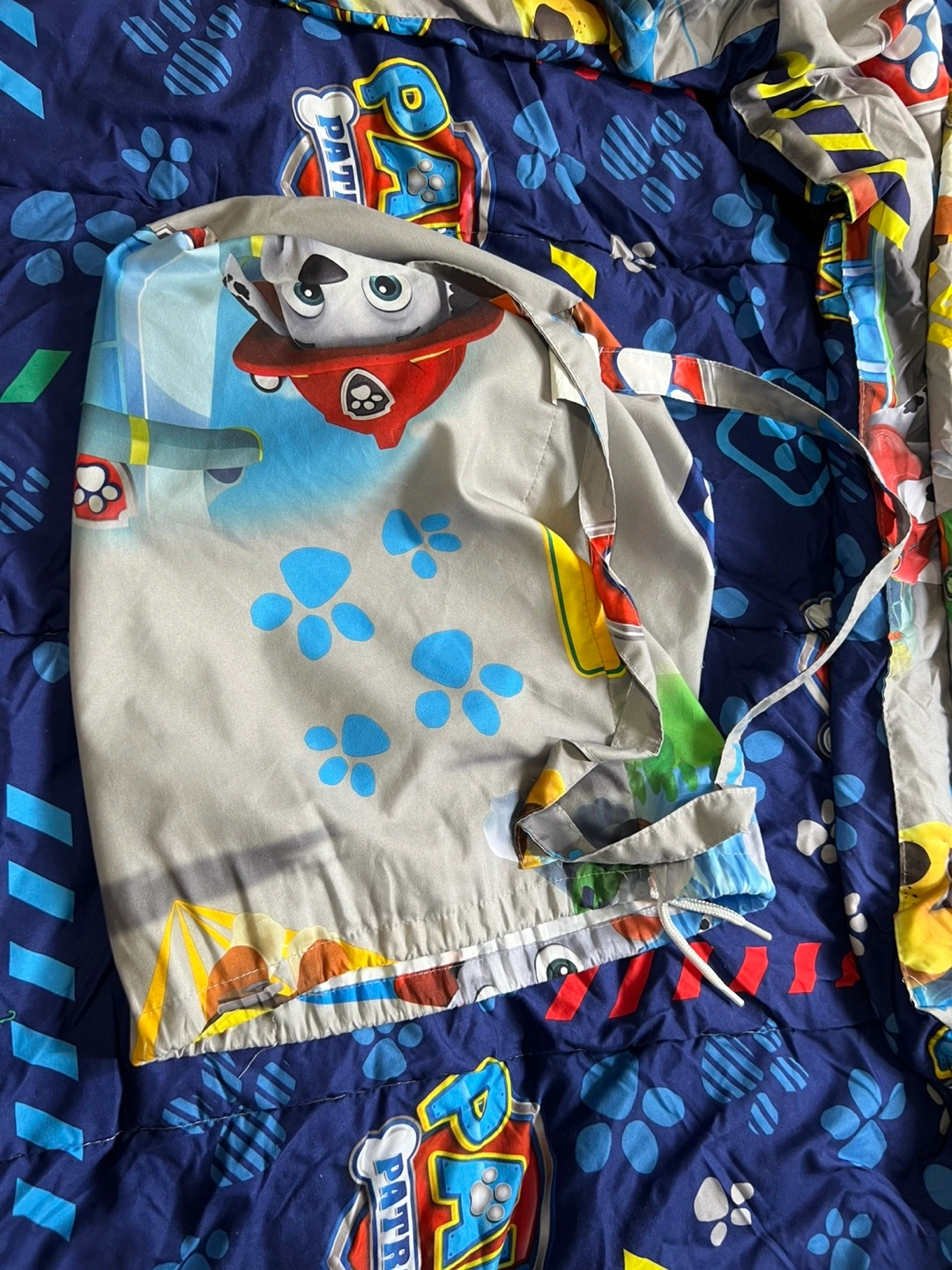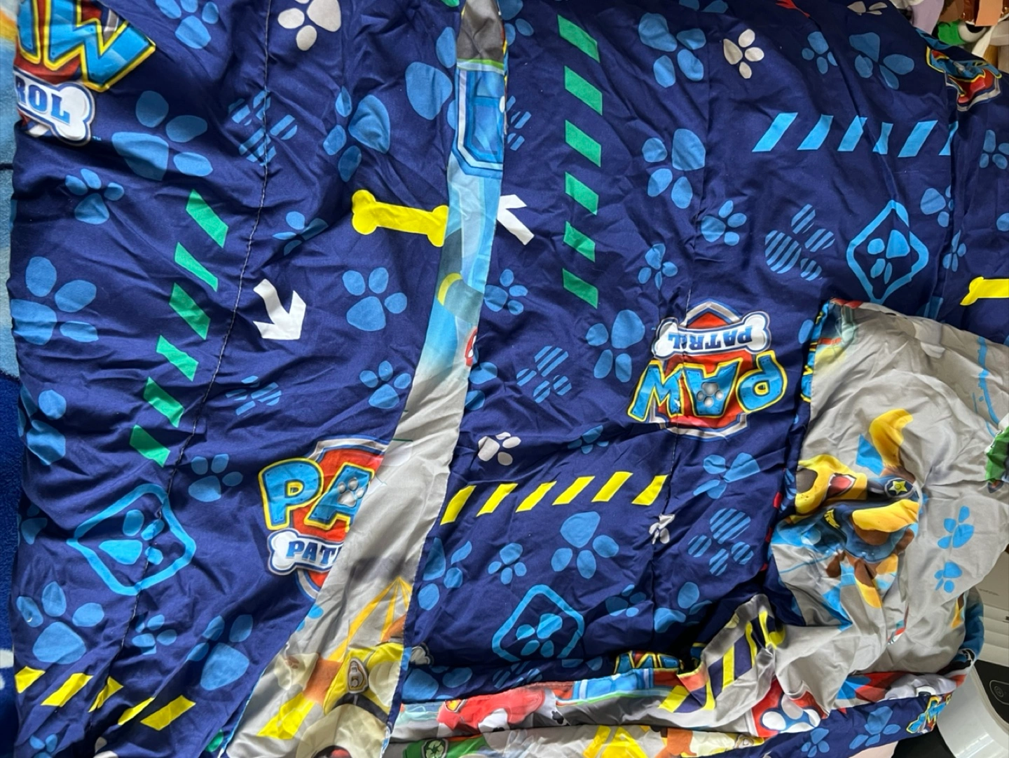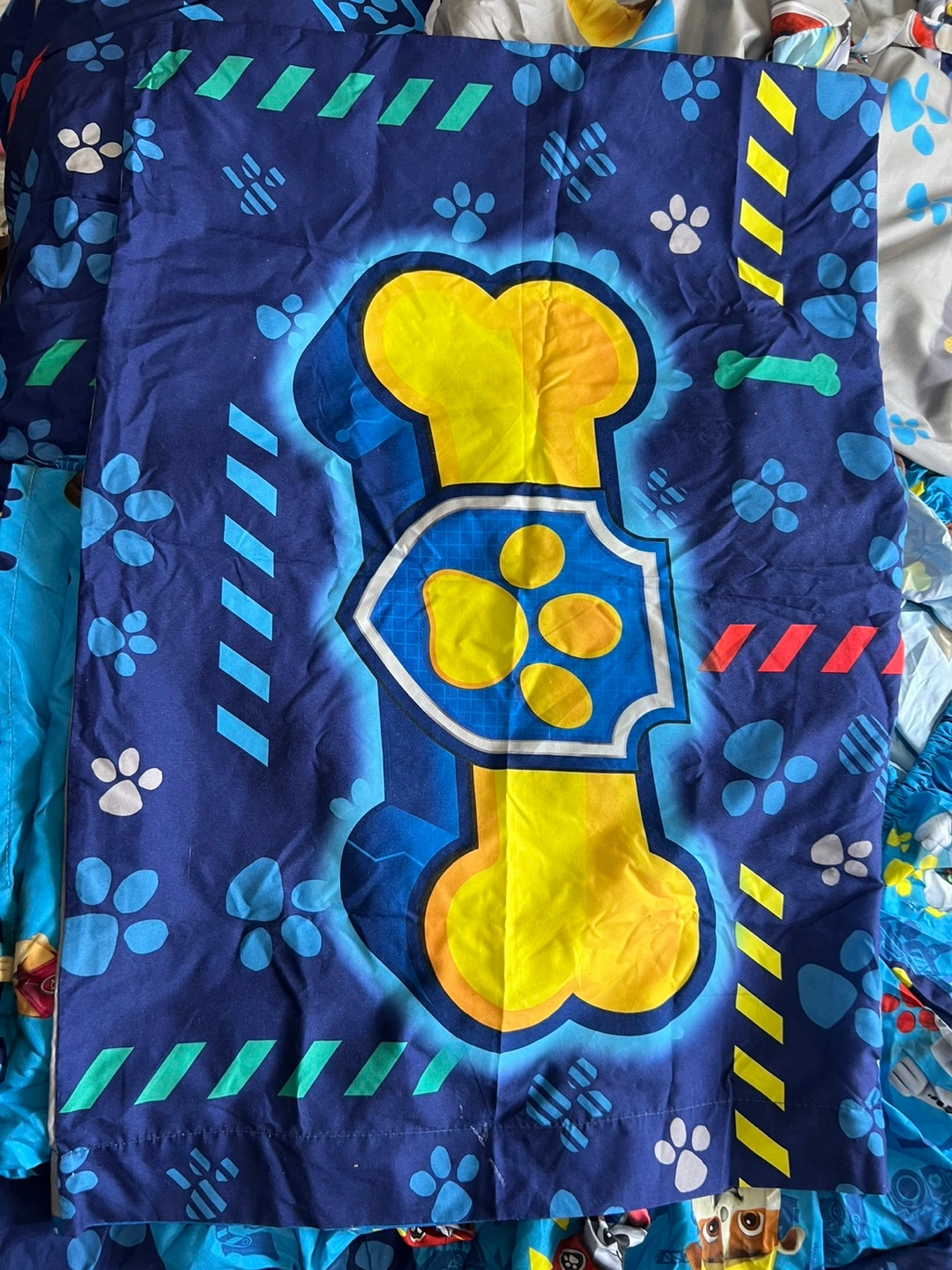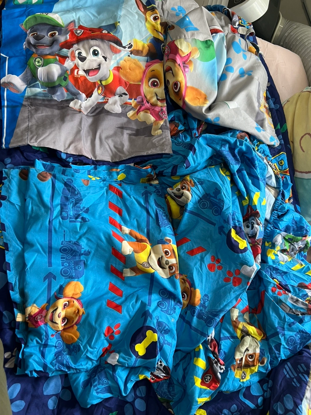 Paw Patrol bedding set featuring the characters from the popular kids' show! Includes a pillowcase and a comforter cover. Comes with Bag Duvet 1-double sided pillowcase Bed sheet cover Flat sheet Pick up only Located near Mt. Pleasant and Eglinton Ave East