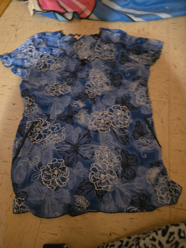 Here's a lovely blue tunic top with a pretty floral and butterfly print. It's perfect for adding a pop of colour and a touch of nature to your wardrobe!