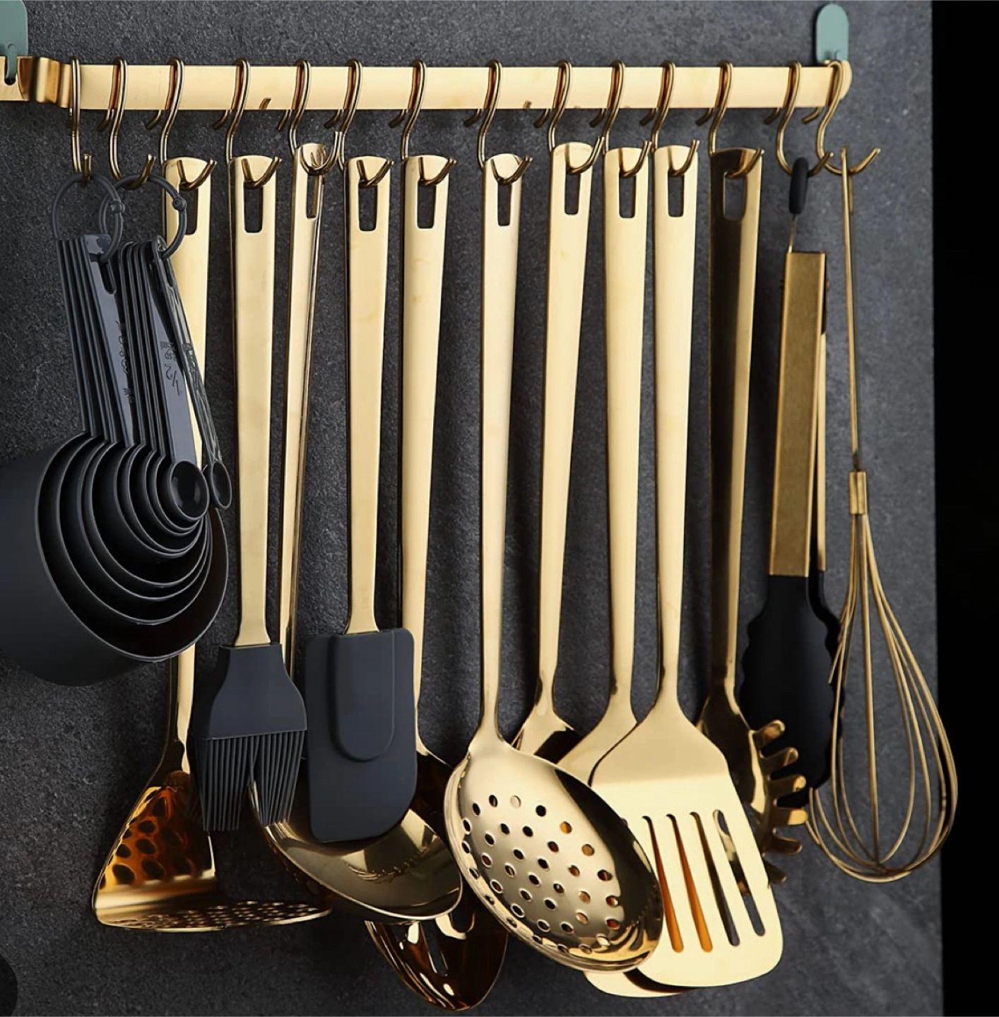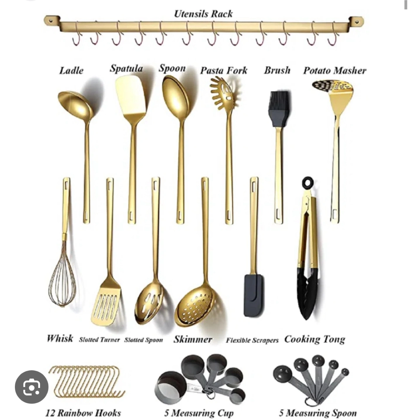 Looking to add some elegance to your kitchen? I'm selling a beautiful gold kitchen utensil set! It comes with a variety of utensils, including ladles, spatulas, spoons, and more, plus a handy rack to keep everything organized. The set also includes measuring cups and spoons for all your baking needs