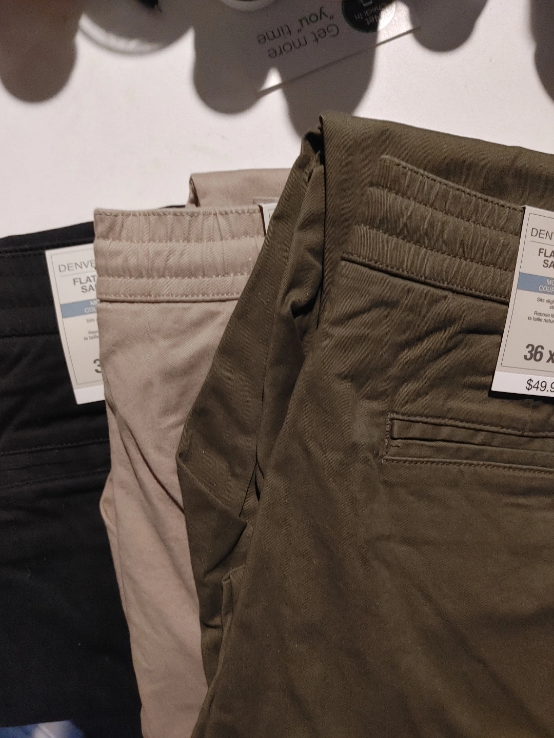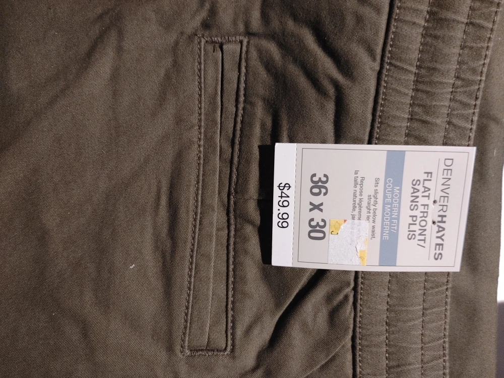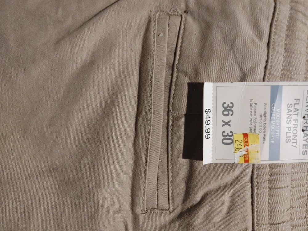 💚THREE PAIRS OF DENVER HAYES FLAT FRONT PANTS! 💚DARK OLIVE, TAN, BLACK 💚BRAND NEW WITH ALL TAGS 💚MENS SIZE 36 X 30 💚REGULAR PRICE OF $49.99 EACH! 💚MODERN FIT. SOTA SLIGHTLY BELOW WAIST, STRAIGHT LEG. 💚I AM LOCATED AT YONGE AND STEELES FOR PICKUP.