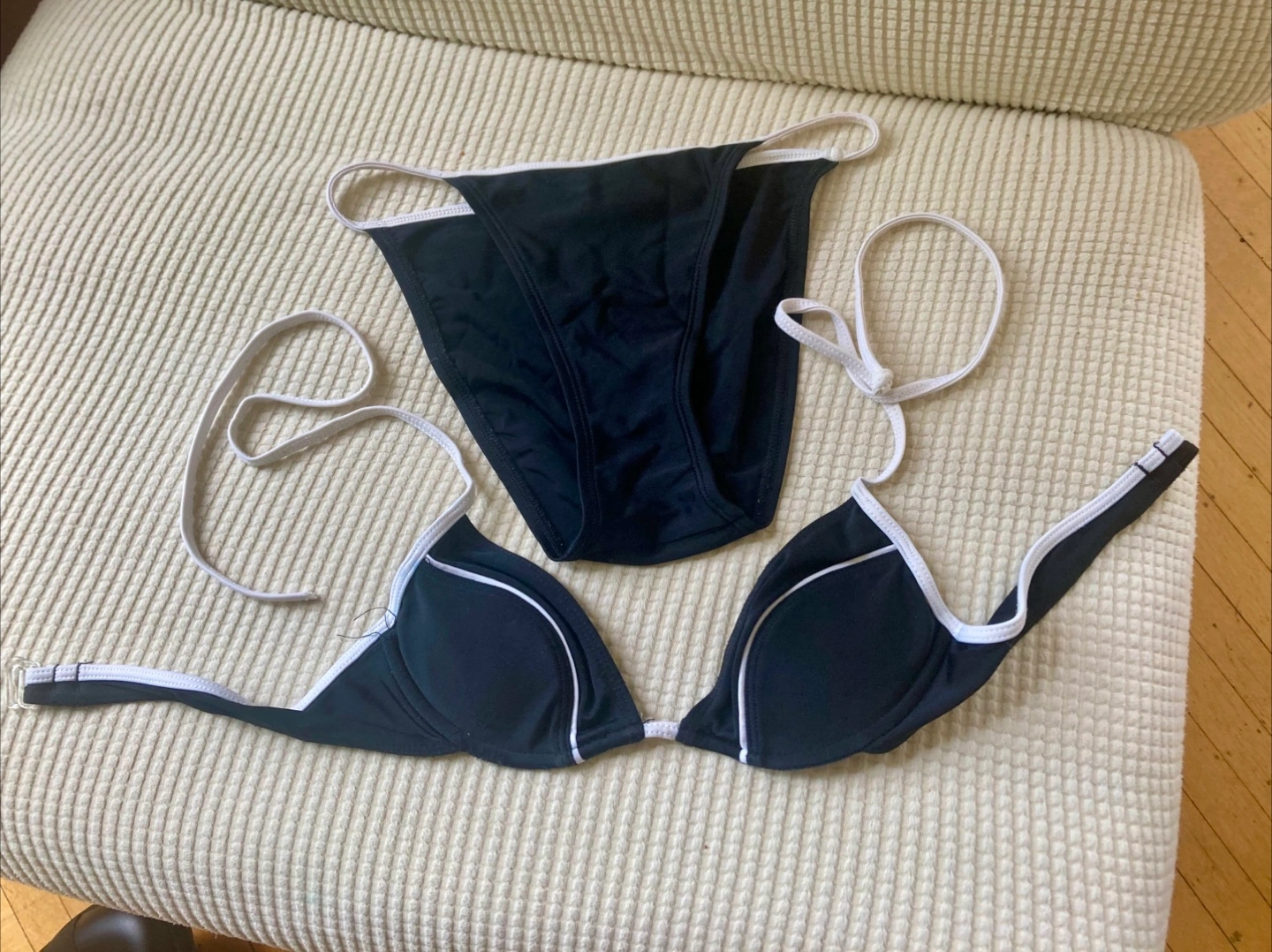 a cute black bikini set with white trim! Still good and perfect for summer. Fits XS/S