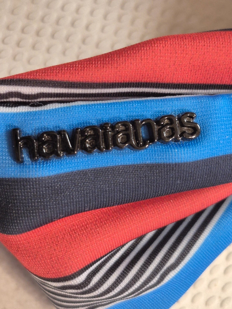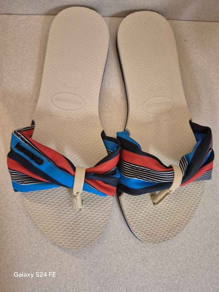 These Havaianas You St Tropez flip flops are in great condition! They feature a colourful striped fabric strap with a cute knot detail. Perfect for adding a pop of colour to your summer outfits!