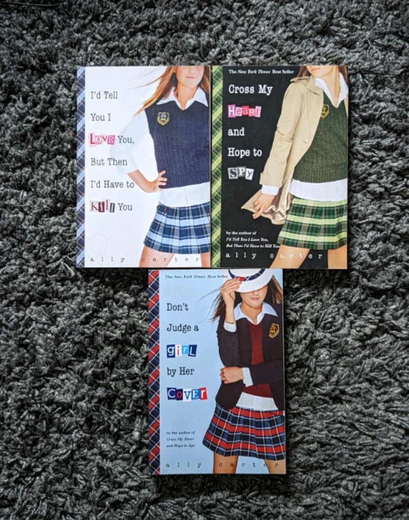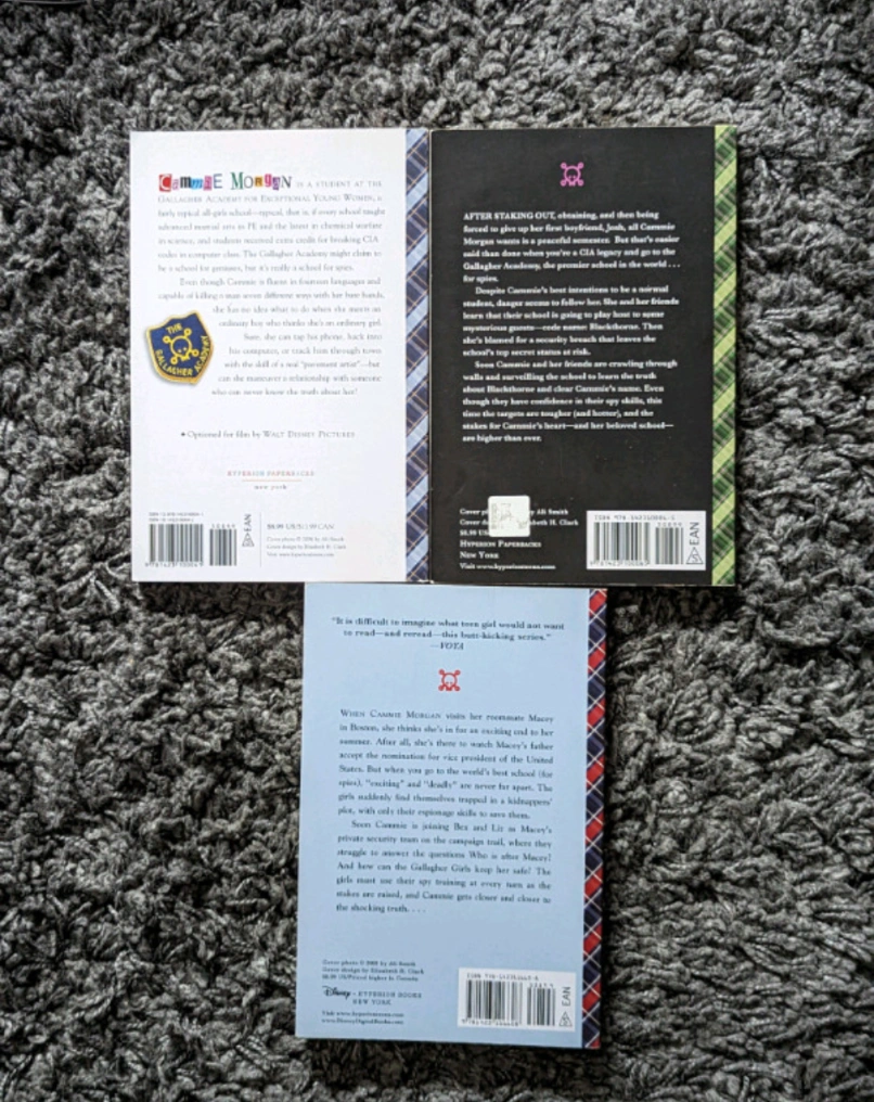 $5 Each or all three for $12 (save $3) Gallagher Girl Series by Ally Carter I'd Tell You I Love You, But Then I'd Have to Kill You (Paper Back - $5) ISBN 9781423100041 Cross My Heart and Hope to Spy (Paper Back - $5) ISBN 9781423100065 Don't Judge a Girl by Her Cover (Paper Back - $5) ISBN 9781423116608