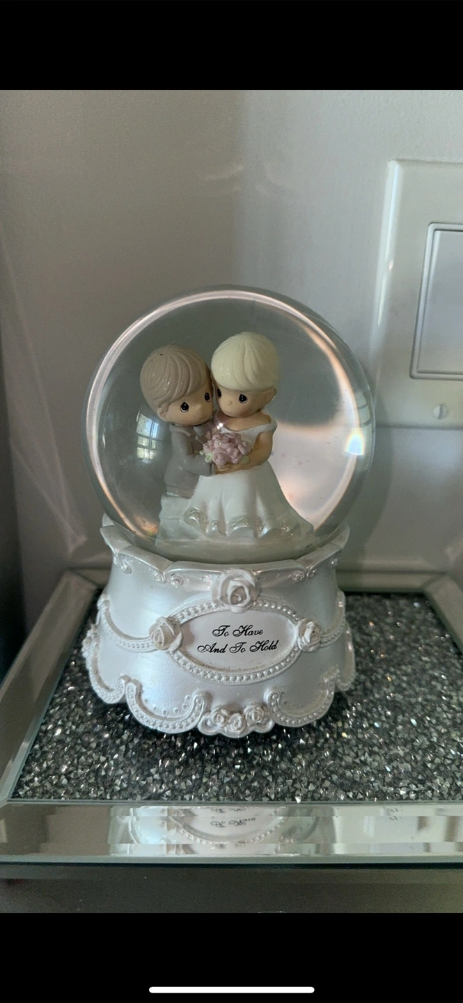 A lovely Precious Moments musical snow globe featuring a couple. The base has the words "To Have And To Hold" on it. Perfect for a wedding gift or a keepsake!