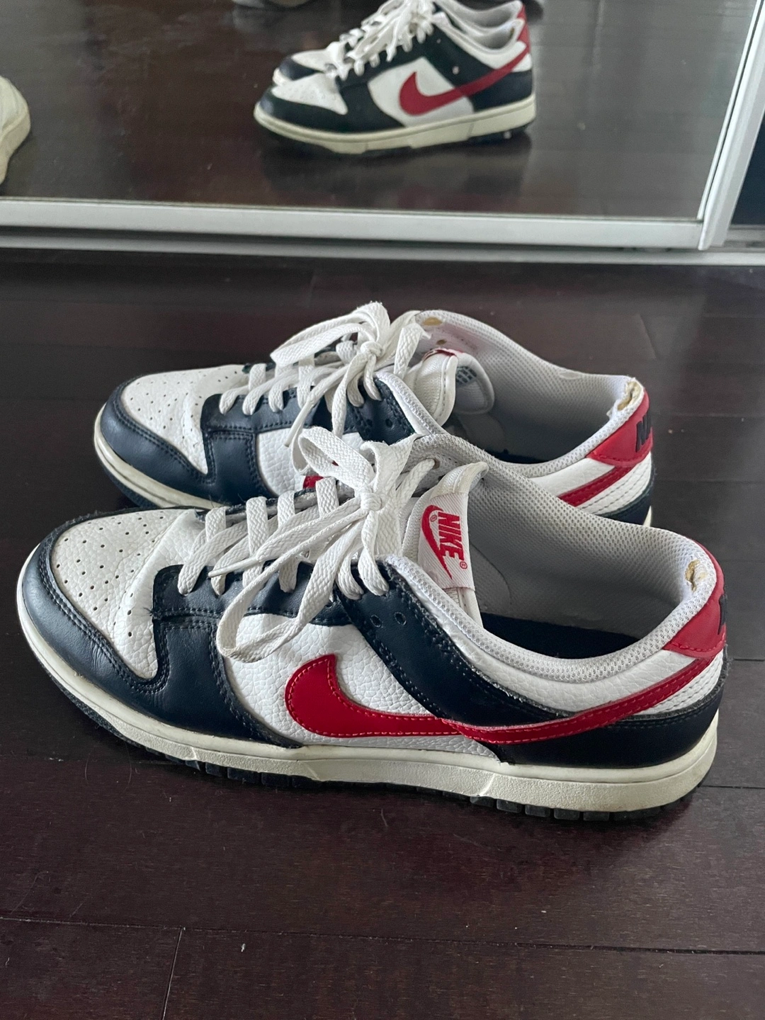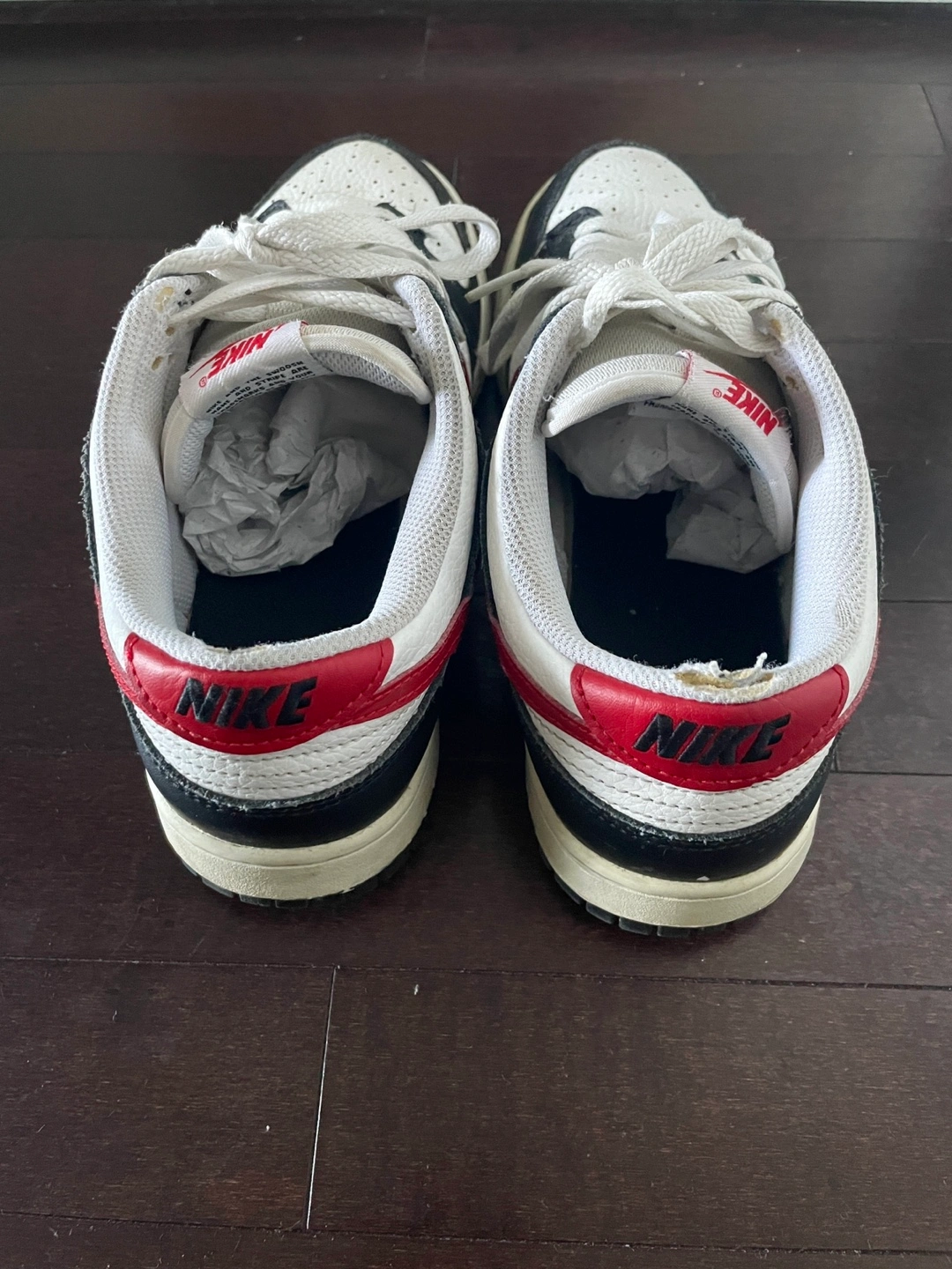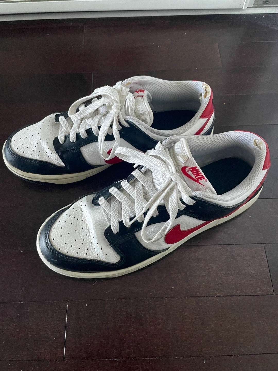 Selling my used Nike Dunks in an okay condition in black and white with the red swoosh. Unfortunately, no box. Pick-up only in downtown. $30 firm.