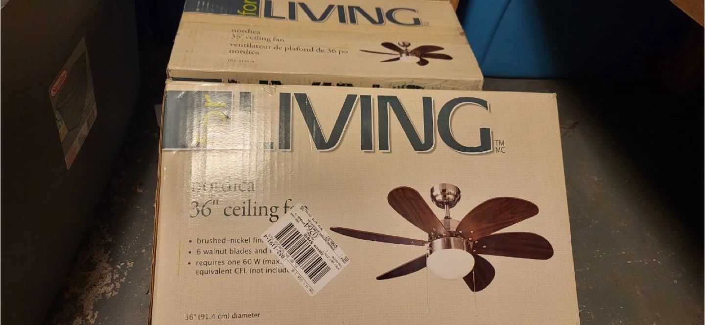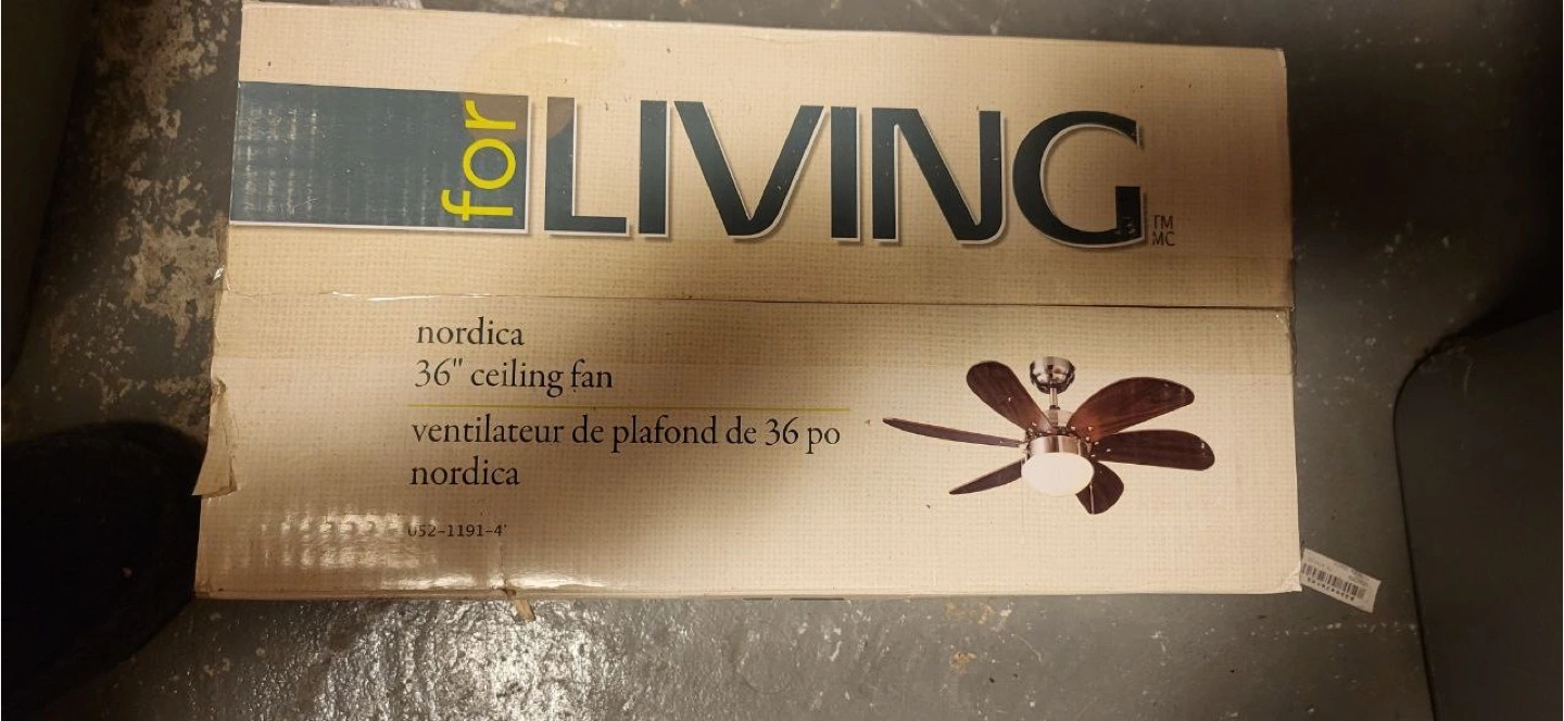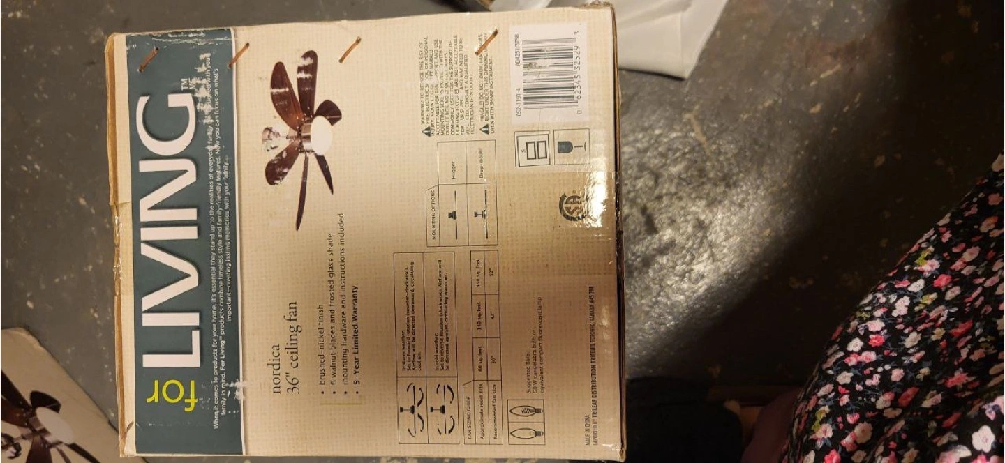 Selling a for LIVING nordica 36" ceiling fan. It features brushed-nickel finish and 6 walnut blades. It also has a frosted glass shade and includes mounting hardware and instructions. The fan requires one 60 W max equivalent CFL (not included). Brand new never opened. $170 each or $200 for both