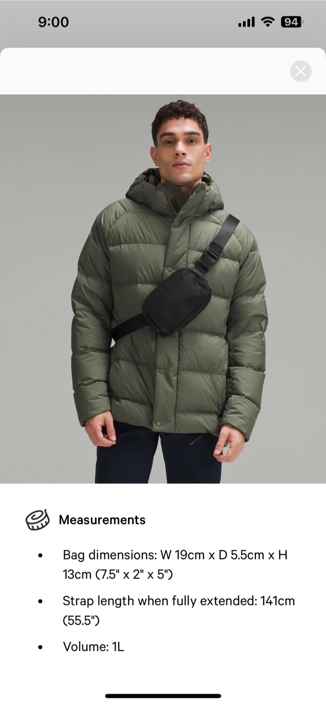 Selling a Lululemon Everywhere Belt Bag in black! It's in great condition and ready for a new home. Bag dimensions: W 19cm x D 5.5cm x H 13cm (7.5" x 2" x 5") Strap length when fully extended: 141cm (55.5") Volume: 1L Pickup at Metrotown area