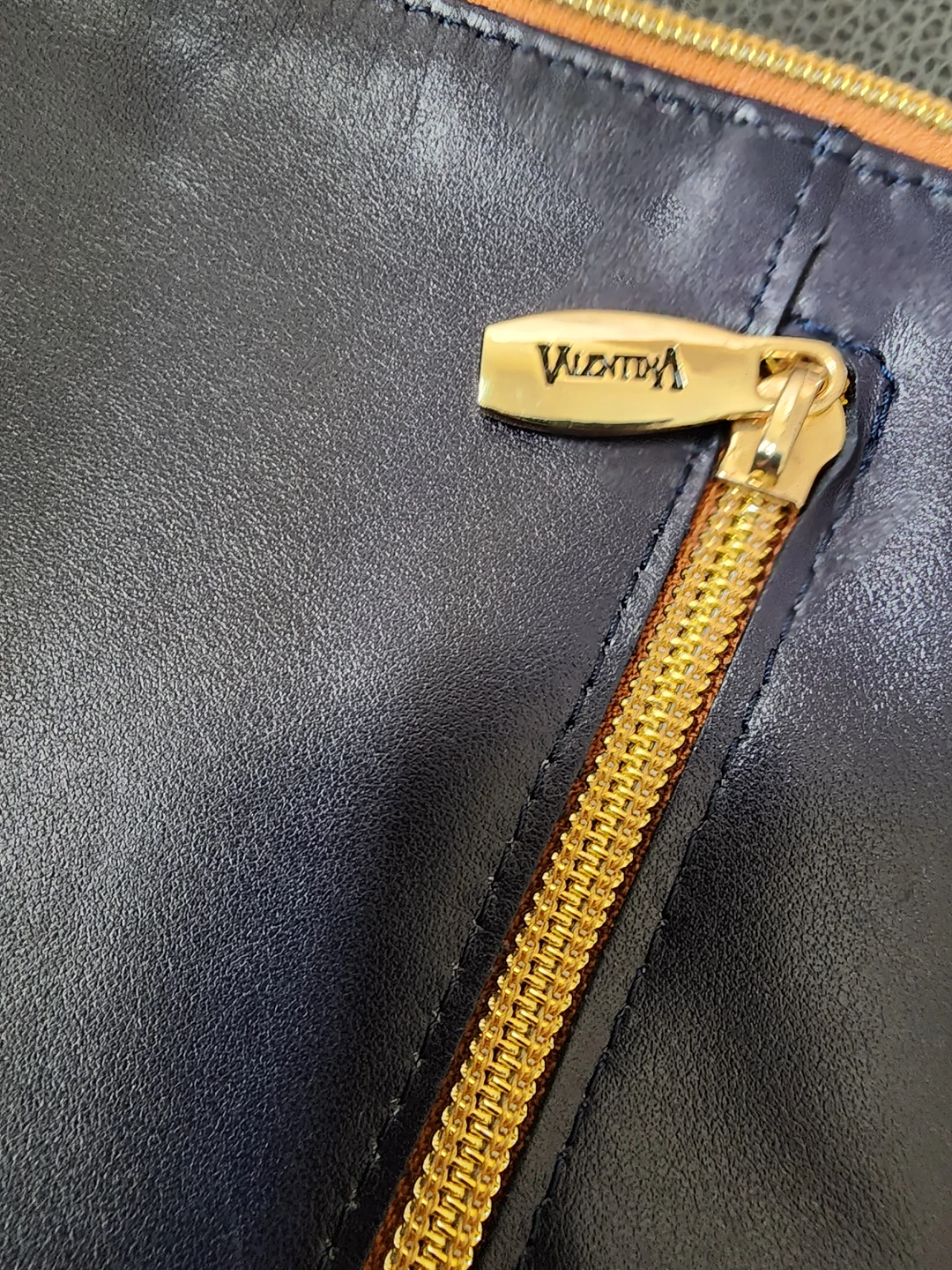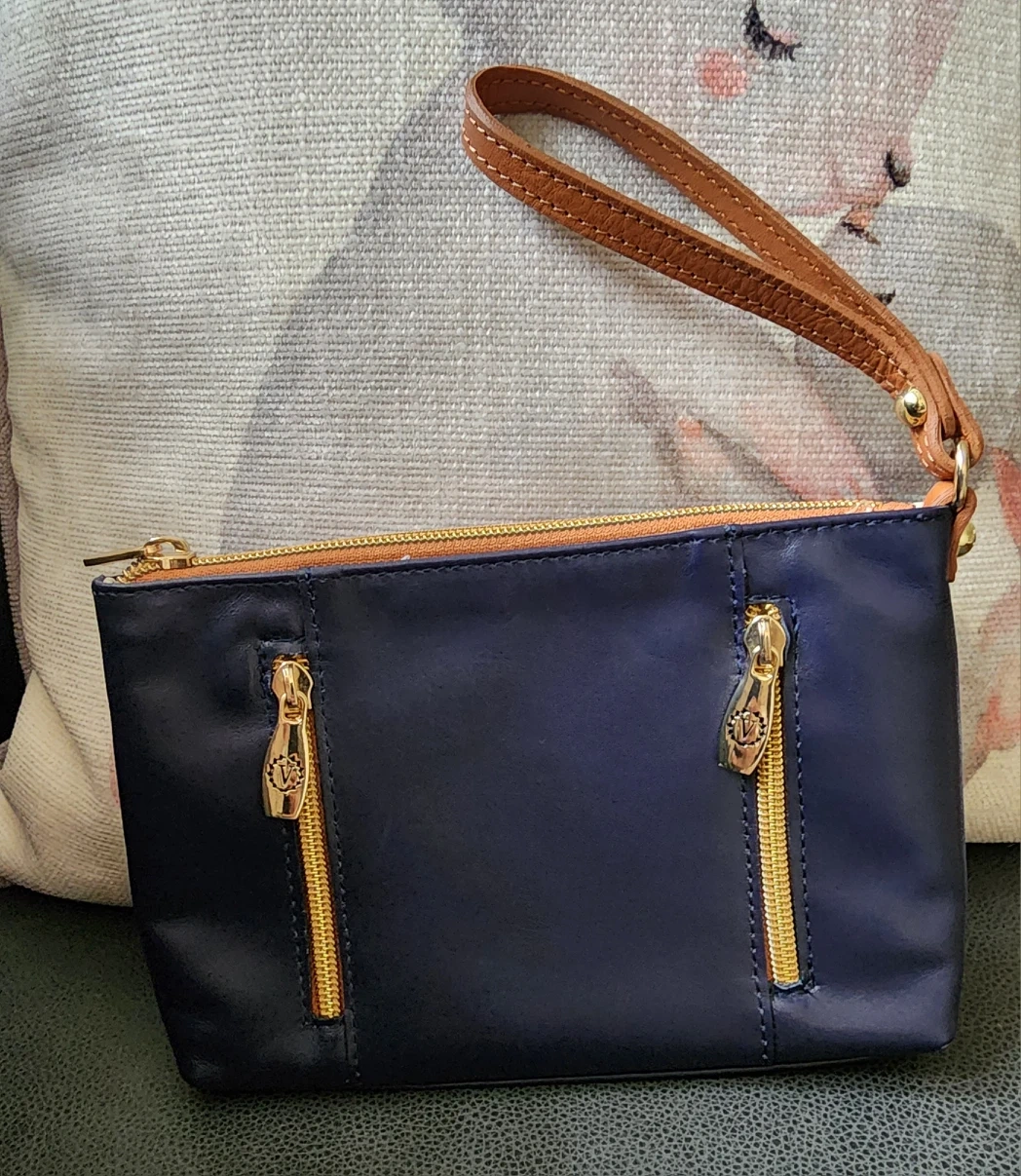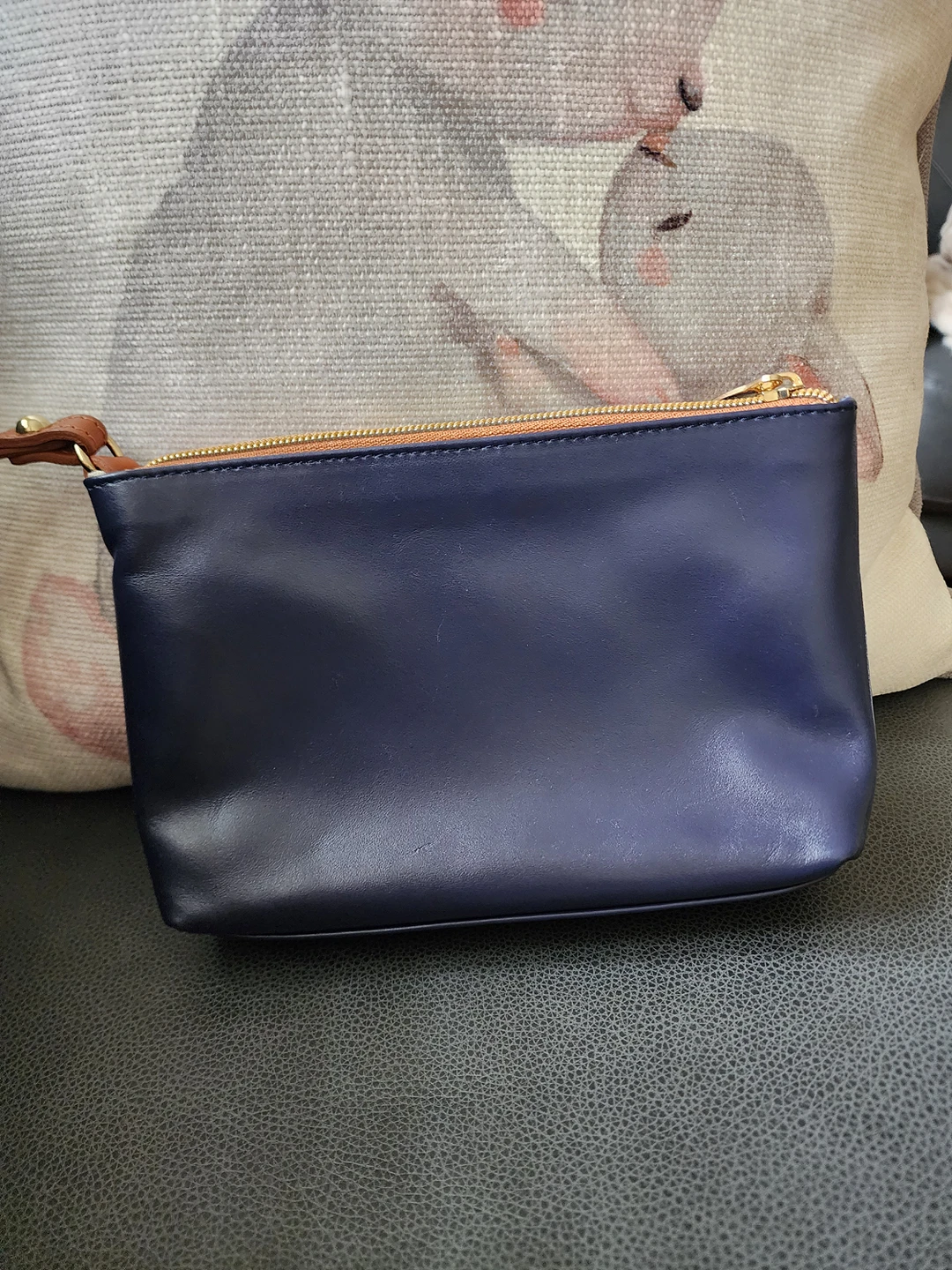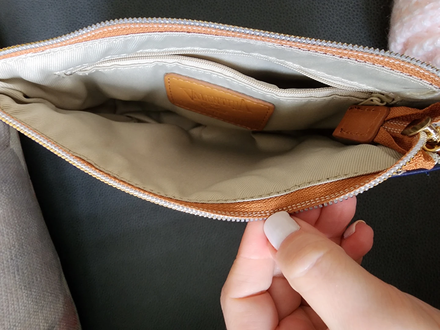 Either brand new or used once. Larger cellsphone will fit. Has one interior pocket and two small exterior pockets the perfect size for a lipstick. Makes a nice make up bag or catch-all.