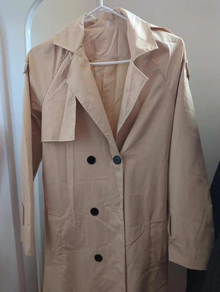 Selling a beige trench coat in size small! It's in great condition and ready for a new home. A perfect addition to your wardrobe for those cooler days