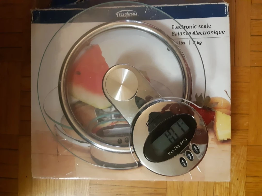 Selling a Trudeau electronic kitchen scale. It can weigh up to 6.5 lbs or 3 kg. It also has a timer and clock feature. It comes with a lithium battery included and the original box