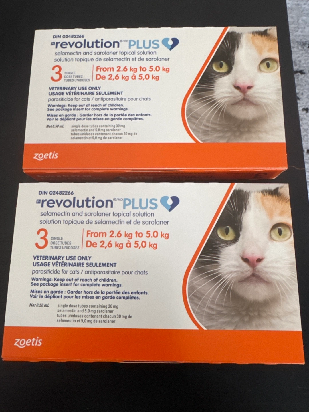 Selling Revolution PLUS flea and tick medicine for cats. Each box contains 3 single-dose tubes, suitable for cats weighing between 2.6 kg to 5.0 kg. Each box contains 3 tubes which is enough for 3 months of coverage for 1 cat. It's a topical medication you apply to the skin once a month to protect against fleas, ticks, ear mites, intestinal parasites and heartworm disease. Expiry date is April 2026. Priced individually at $60 a box.