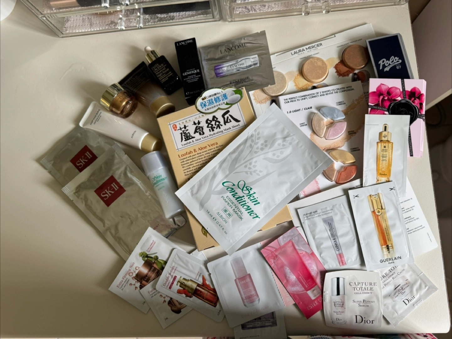 Bundle includes: 1. SKII facial treatment masks (2 pieces); 2. Aloe Vera hydrating masks (5 pieces); 3. Albion essential paper mask (1); 4. Albion skin conditioner - 27 ml; 5. Albion infinesse derma pump milk - 30g; 6. Estée Lauder advanced cleansing gel - 30 ml; 7. Estée Lauder revitalizing supreme + eye balm - 5 ml; 8. Estée Lauder advanced night repair -15 ml; 9. Lancôme advanced Génifique- 7 ml; Various skin care samples from Dior, Clarins, Guerlain and Clinique. Make up samples from Laura Mercier and Make Up Forever Perfume samples from Ralph Lauren Polo and Viktor & Rolf