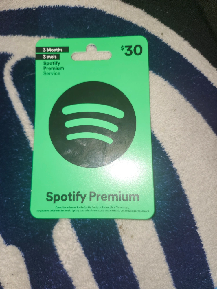 Selling a Spotify Premium gift card for 3 months of service, valued at $30! It's perfect for anyone who loves music and podcasts. This gift card can be redeemed for an individual Spotify Premium subscription. Scratch off for the PIN number to redeem it!