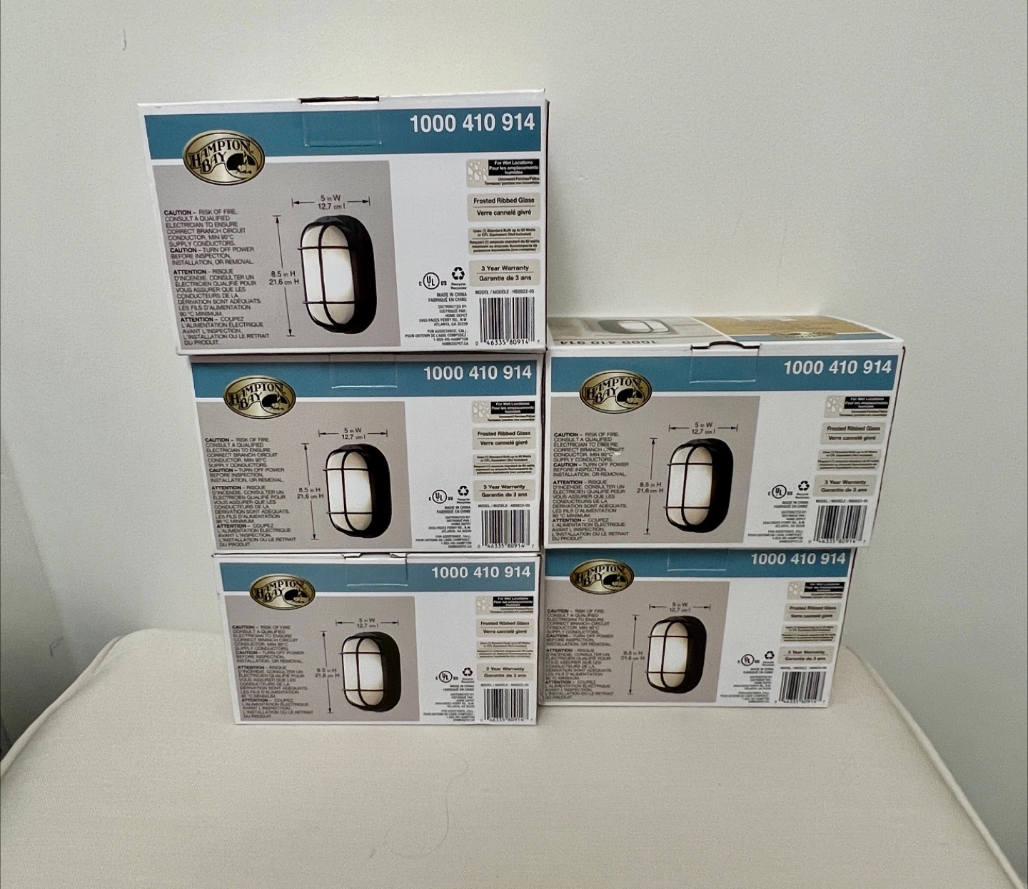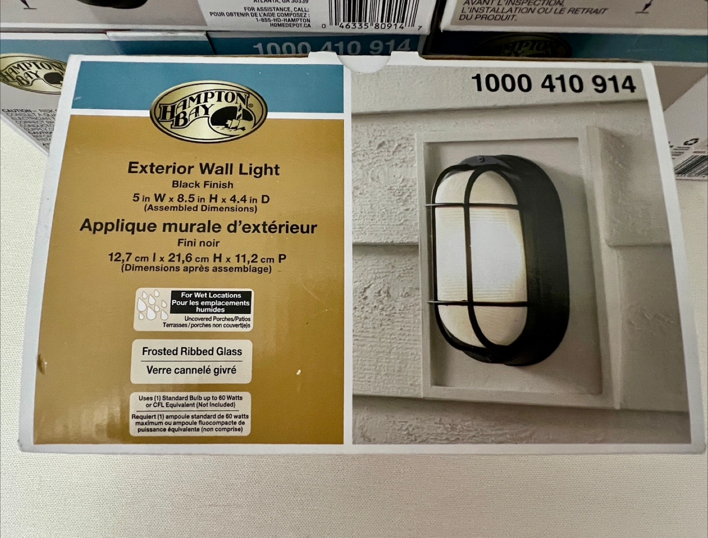 Hampton Bay exterior wall lights with black finish Measures 5 inches in width, 8.5 inches in length, and 4.4 inches in height. These lights feature frosted ribbed glass and accommodate a standard bulb up to 60 watts or CFL equivalent (bulb not included). Specifications: * Brand: Hampton Bay * Finish: Black * Dimensions: 5" W x 8.5" H x 4.4" D * Glass: Frosted Ribbed * Bulb Compatibility: Up to 60W standard or CFL equivalent Based on similar listings, these lights typically sell for around $30-$50 each, but since these are new in box, I'm pricing them at $40 each. If this ad is still up, the lights are still available, so no need to ask!
