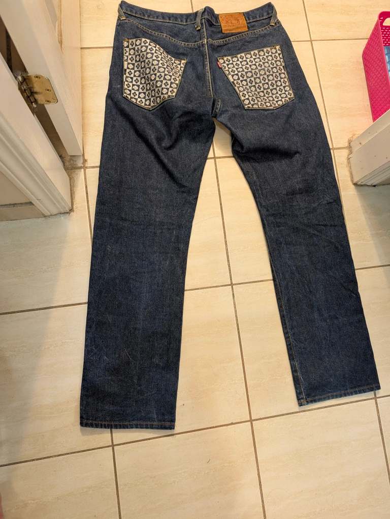 Selling a pair of Evisu jeans, Lot 2007, size 36x34. They feature a unique embroidered design on the back pockets. Great for adding a touch of style to your wardrobe!