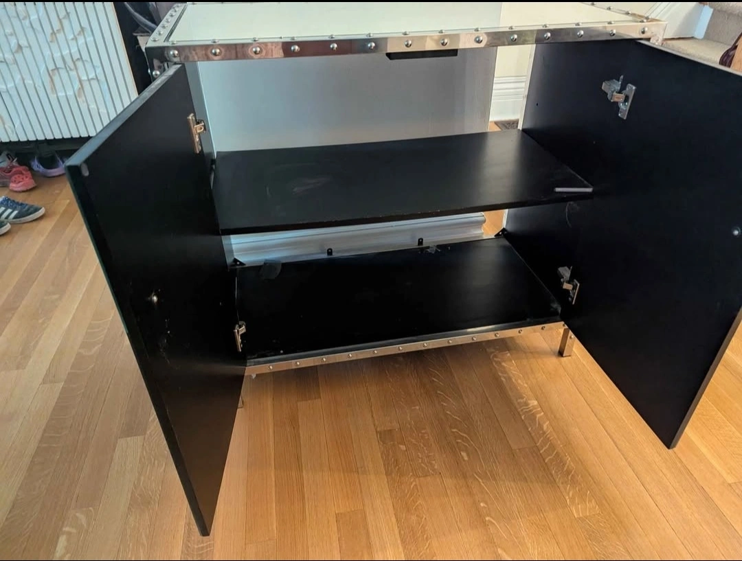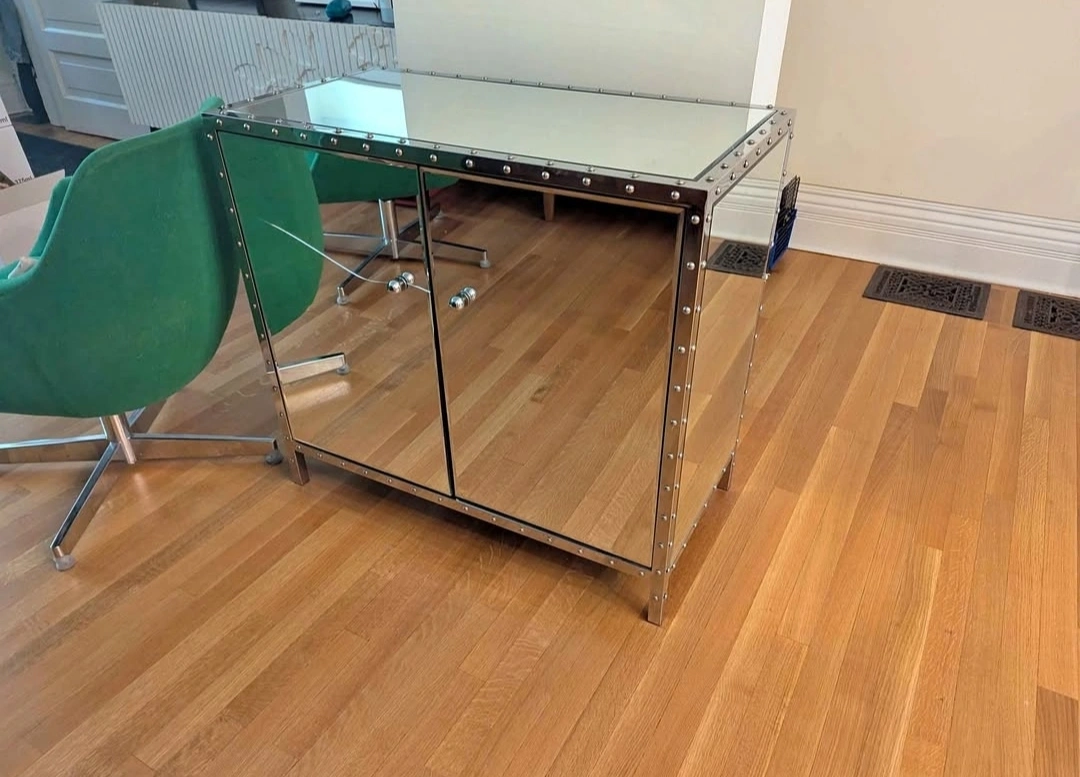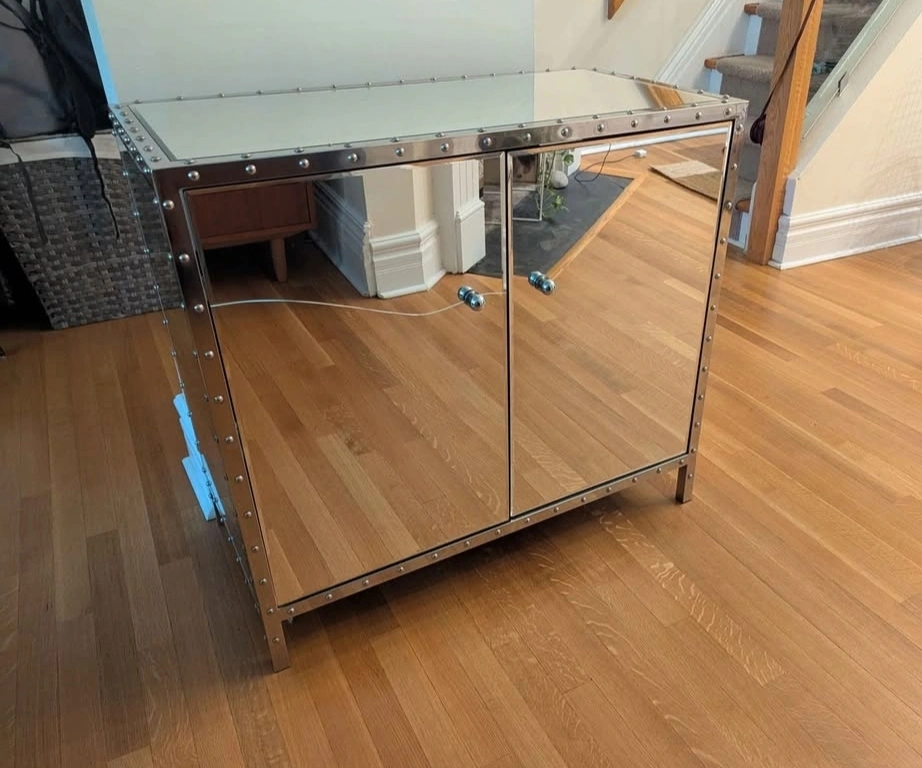 This mirrored accent cabinet would be a great addition to any room! It features a sleek design with mirrored panels and silver-tone hardware. It offers storage space behind two doors, perfect for keeping your space organized and stylish. Overall it’s in good condition. The line you noticed is just a minor flaw — the mirror has a small crack, but it doesn’t affect the use. Possibly to be delivered for extra 15 CAD in Downtown area.