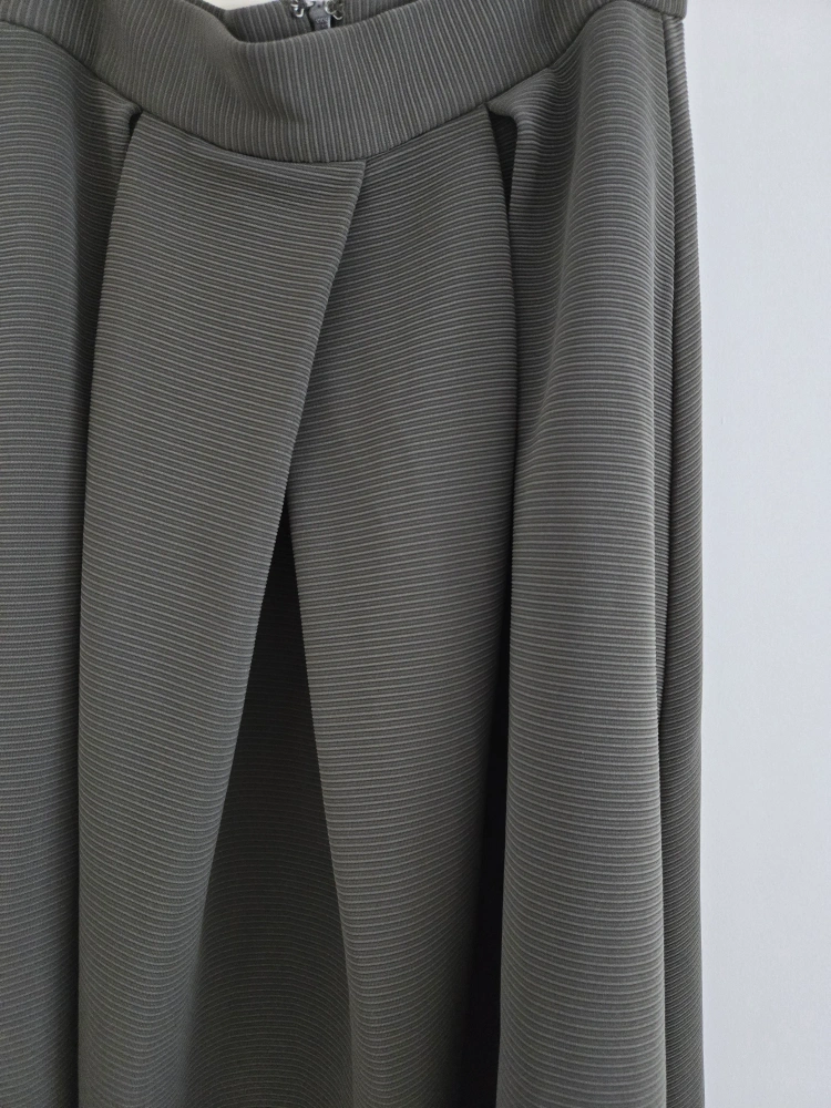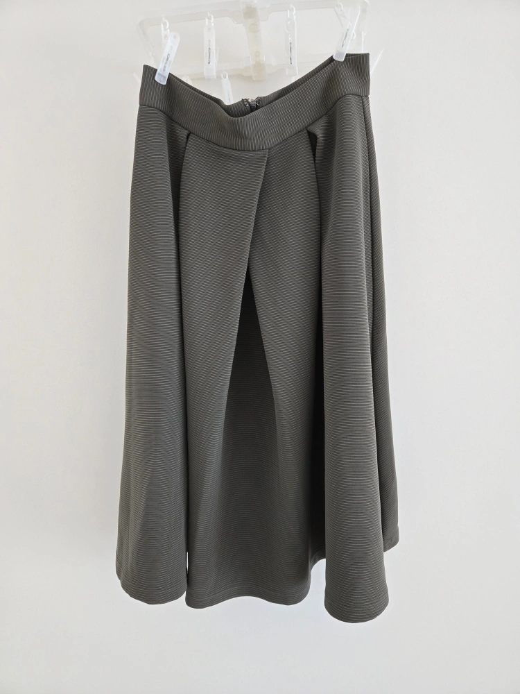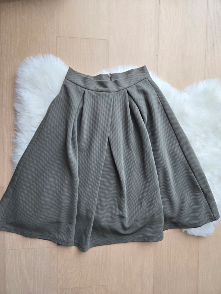 A stylish olive green skirt with a ribbed texture! It's in great condition and ready for a new home. The skirt has a unique pleated front design, making it a versatile piece for any wardrobe Size medium Asian fit which is usually size small in North America Very thick material from Uniqlo sister brand, GU from Japan