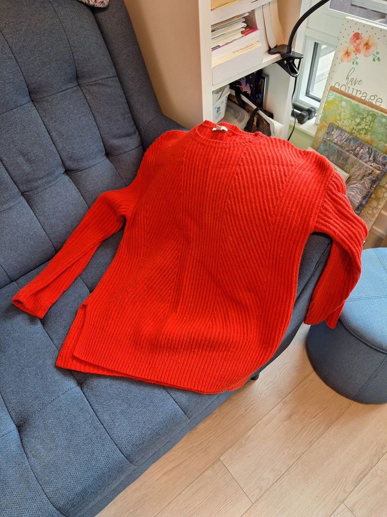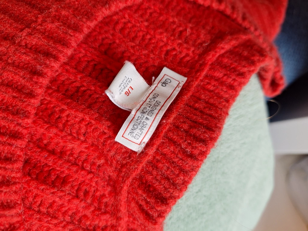 Cozy up in this vibrant orange/red knit sweater from GAP! It's a size L and perfect for adding a pop of colour to your wardrobe. The material is soft and comfortable, great for those chilly days.