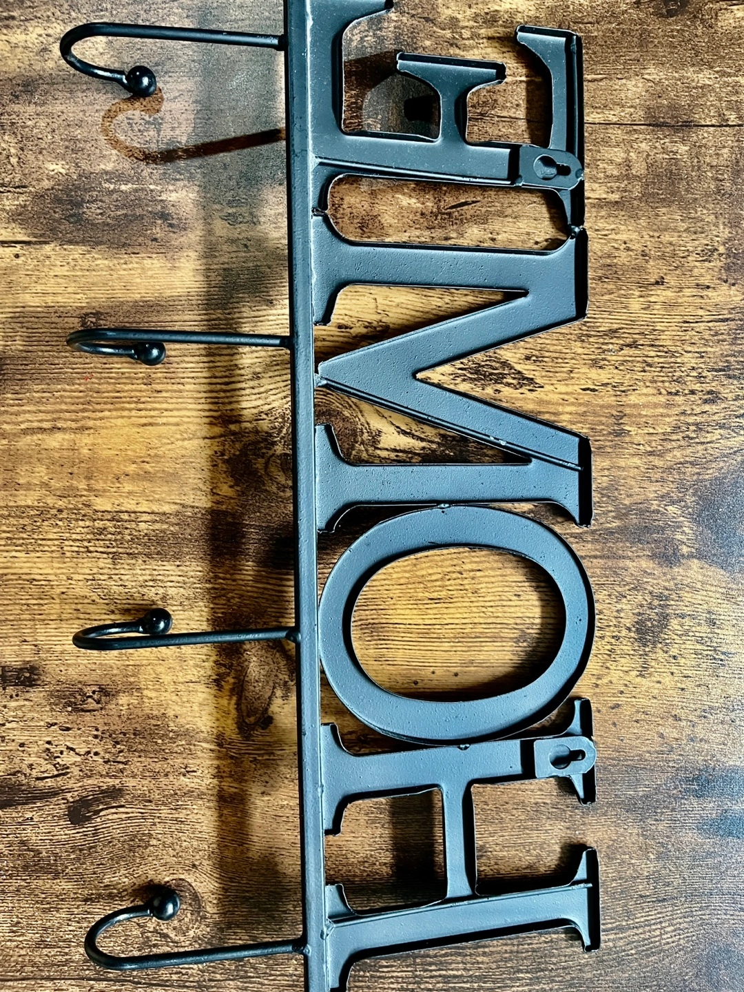 Here's a cute metal "HOME" hook rack! It's black and would be perfect for hanging keys, coats, or anything else you need by the door