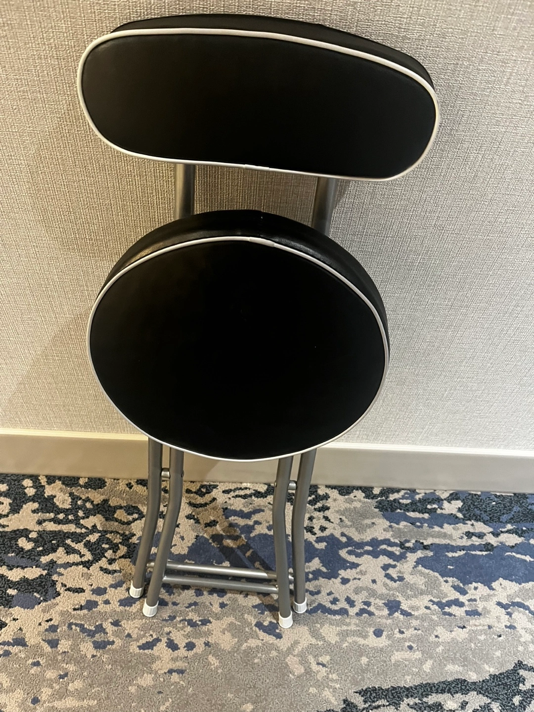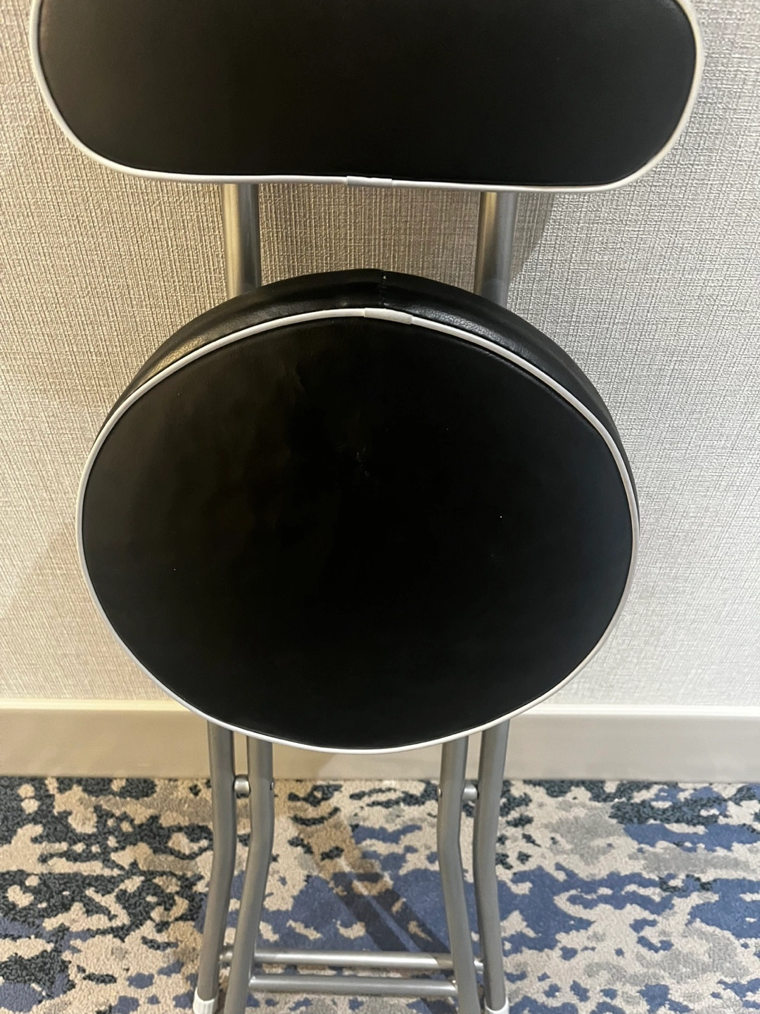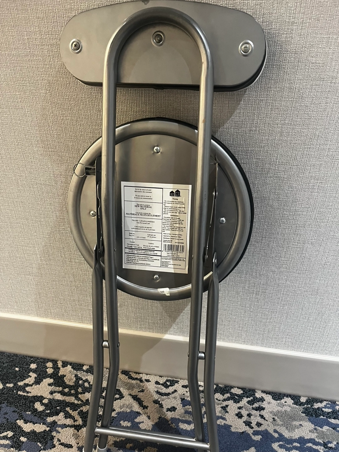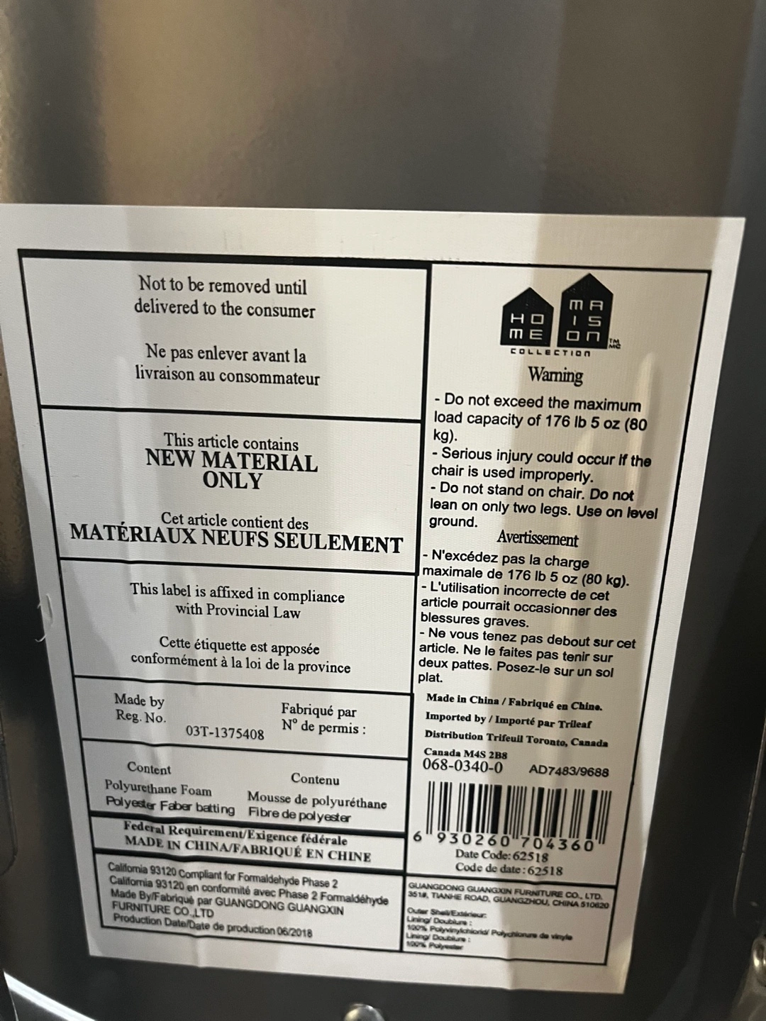 This is a new folding stool from Home Maison Collection. It's made with new material only, as indicated on the label. The seat and back are made of polyurethane foam and faber batting. It's a great stool to have around when you need an extra seat