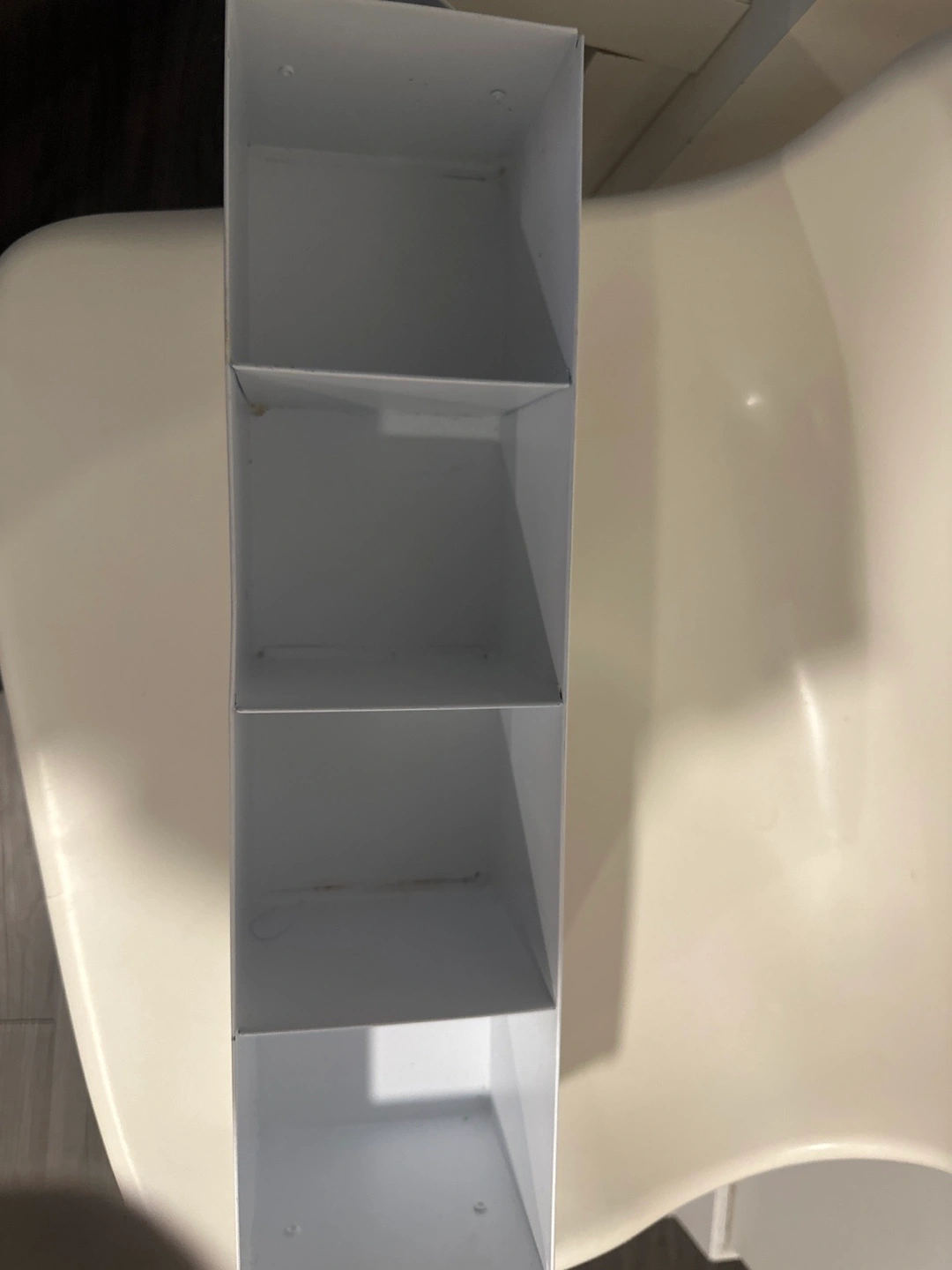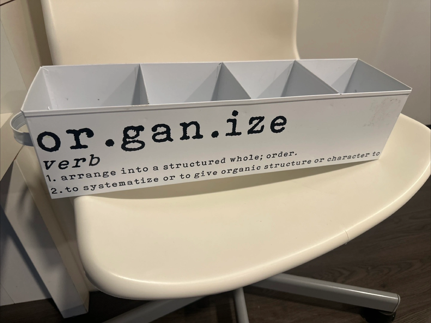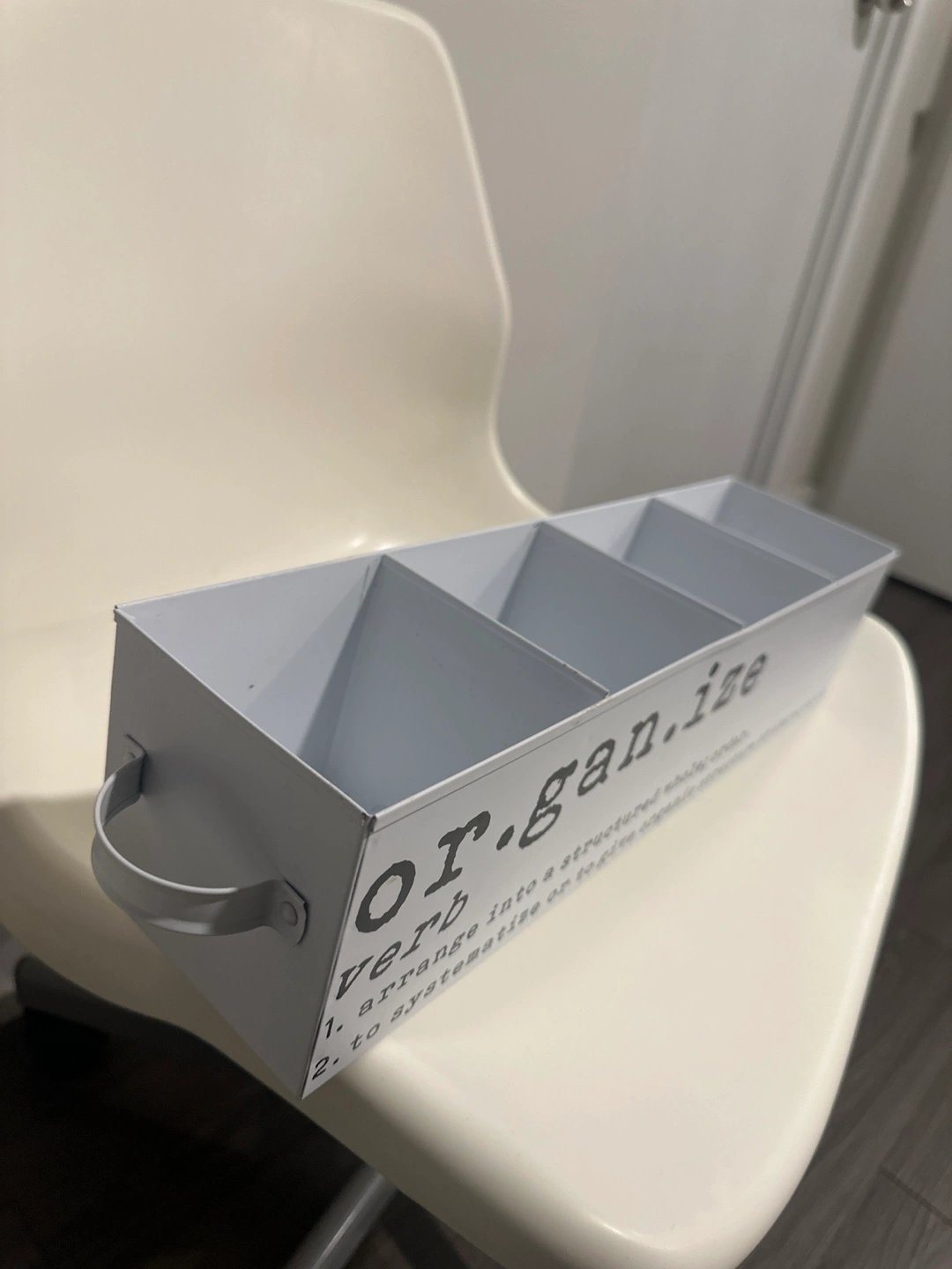 Declutter your space with this handy white metal organizer! It features four compartments, perfect for tidying up your desk, shelves, or any area that needs a little organization. The word "organize" and its definition are printed on the side, adding a touch of style to its functionality