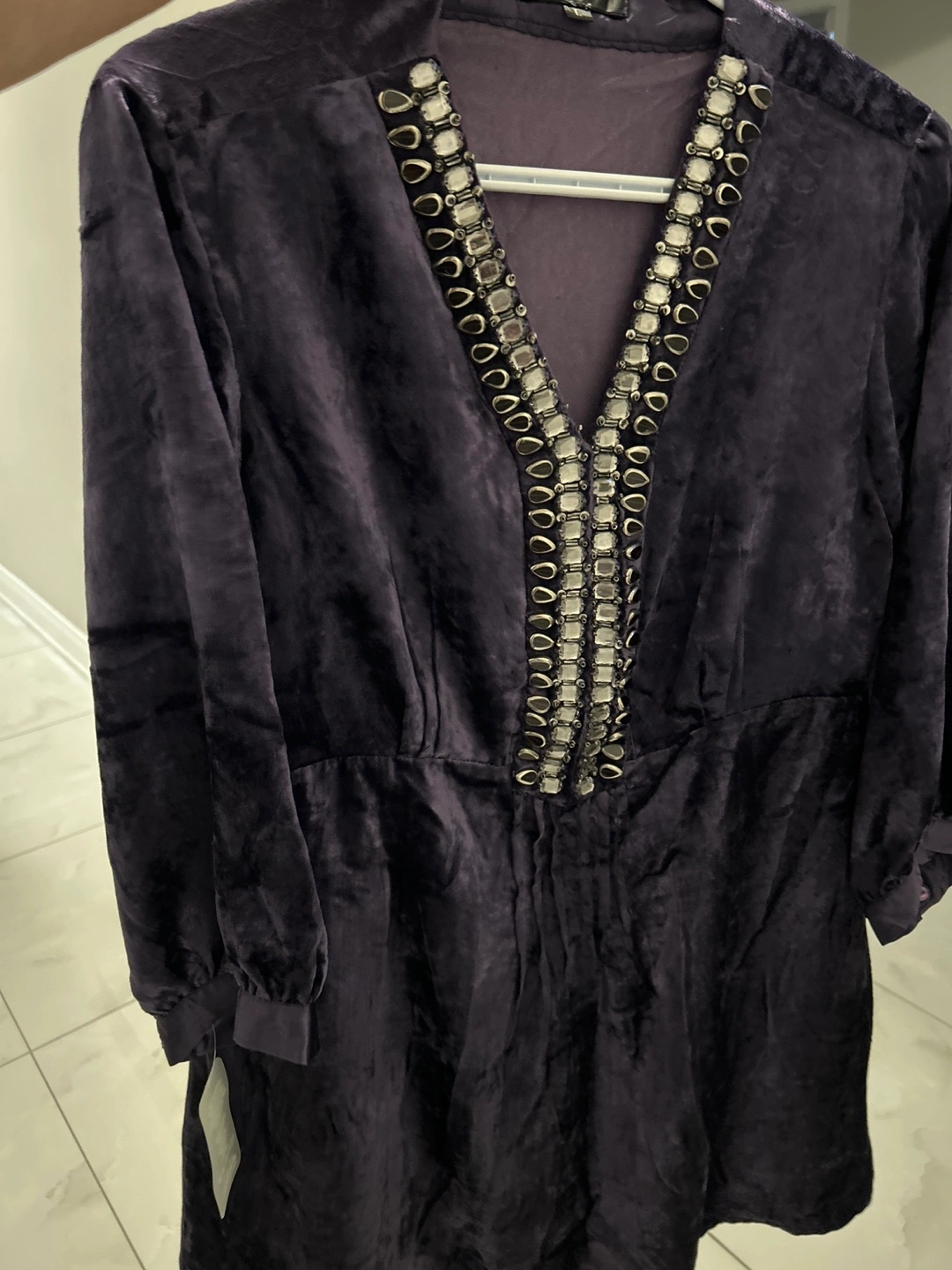Selling a lovely purple velvet dress in size large! The dress features unique beaded detailing around the neckline. Brand new with tag