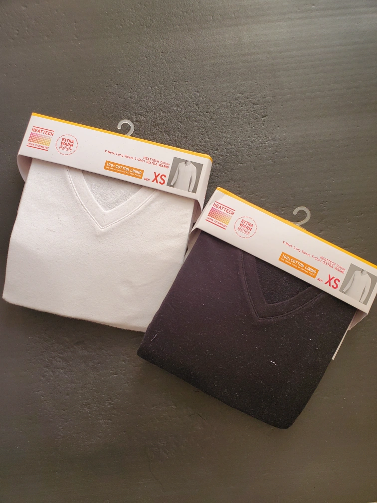 I have two Uniqlo Heattech V-neck long-sleeve T-shirts available in size XS. They're made of 53% cotton, 42% acrylic, and 5% spandex. Perfect for layering and staying warm! $20 each, $35 for both Meetup in Downtown Toronto