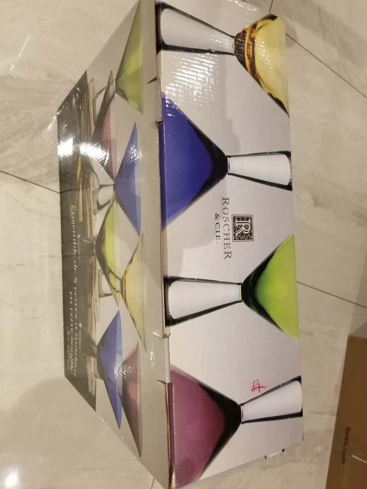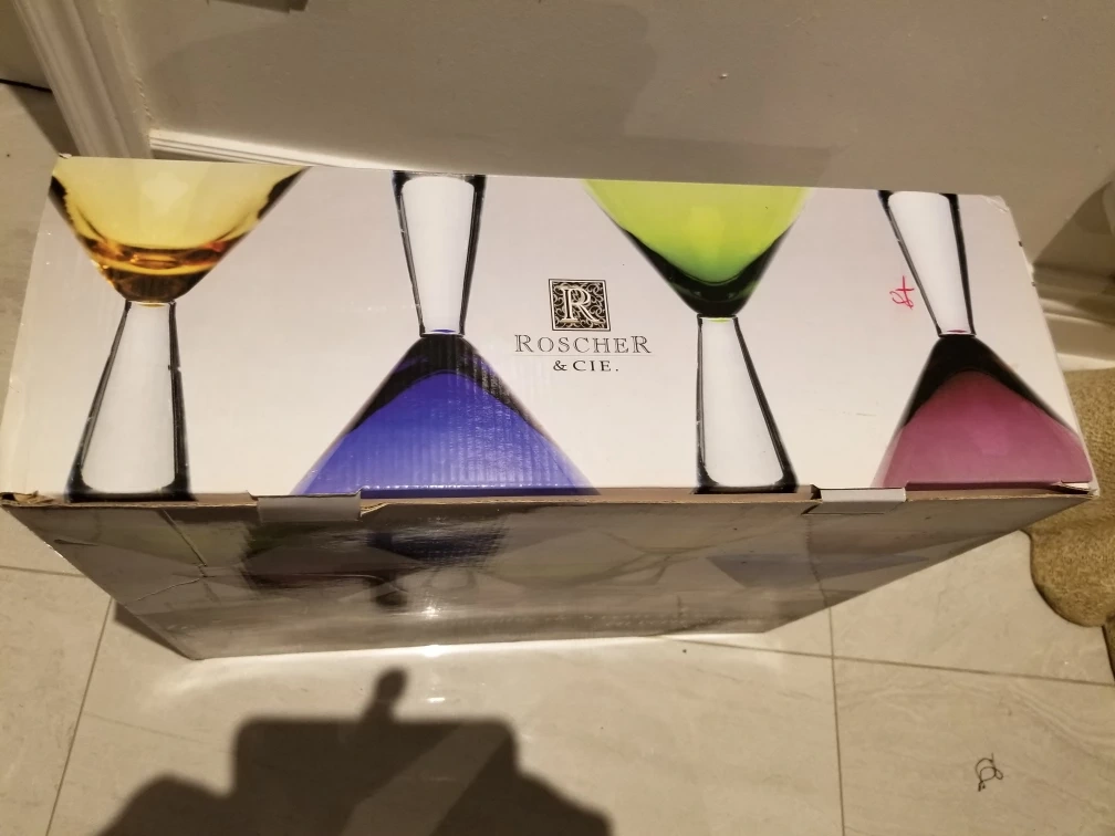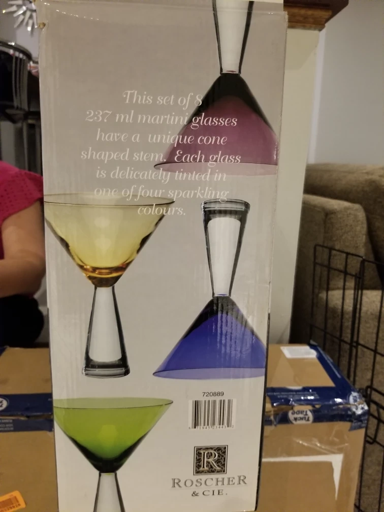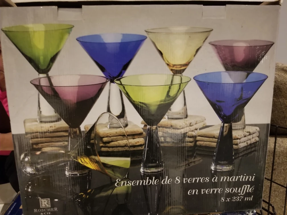 New Martini Glasses in the original box. Set of 8 Roscher & Cie. ! They come in a variety of colours and are in excellent condition. Each glass holds 237 ml. The original box is included! Pick up location is near steels and leslie