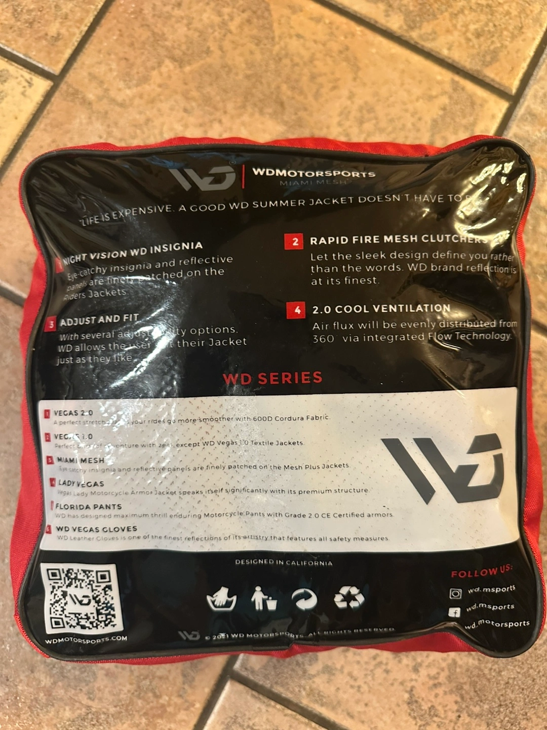 Selling a WD Motorsports Miami Mesh motorcycle jacket! It features night vision WD insignia, rapid fire mesh clutchers, and 2.0 cool ventilation. The jacket has several adjustability options to fit just like you like! Size large