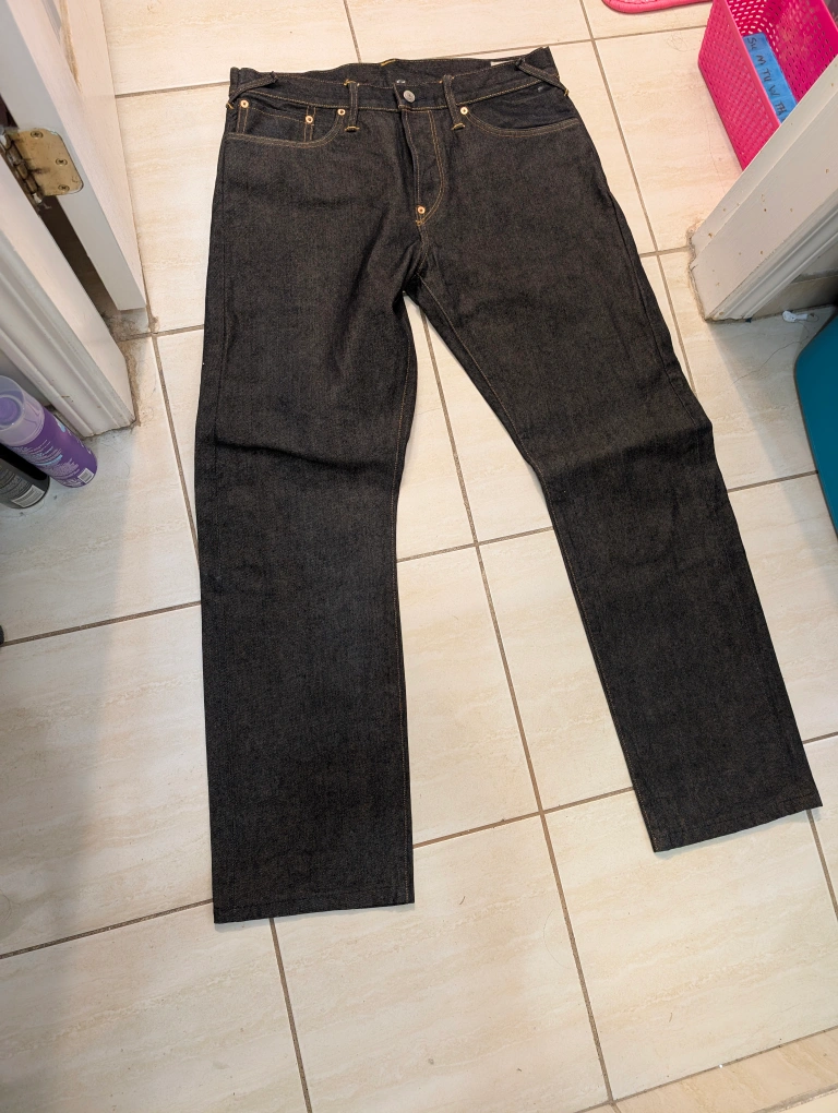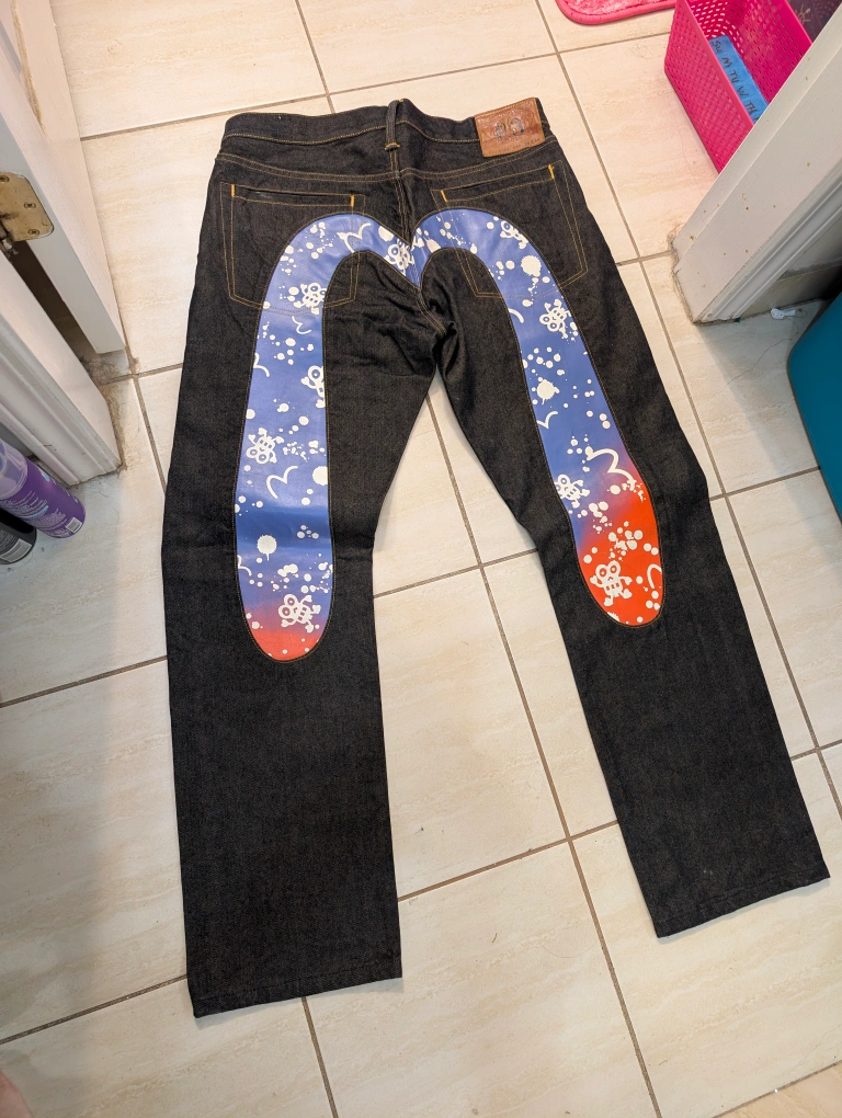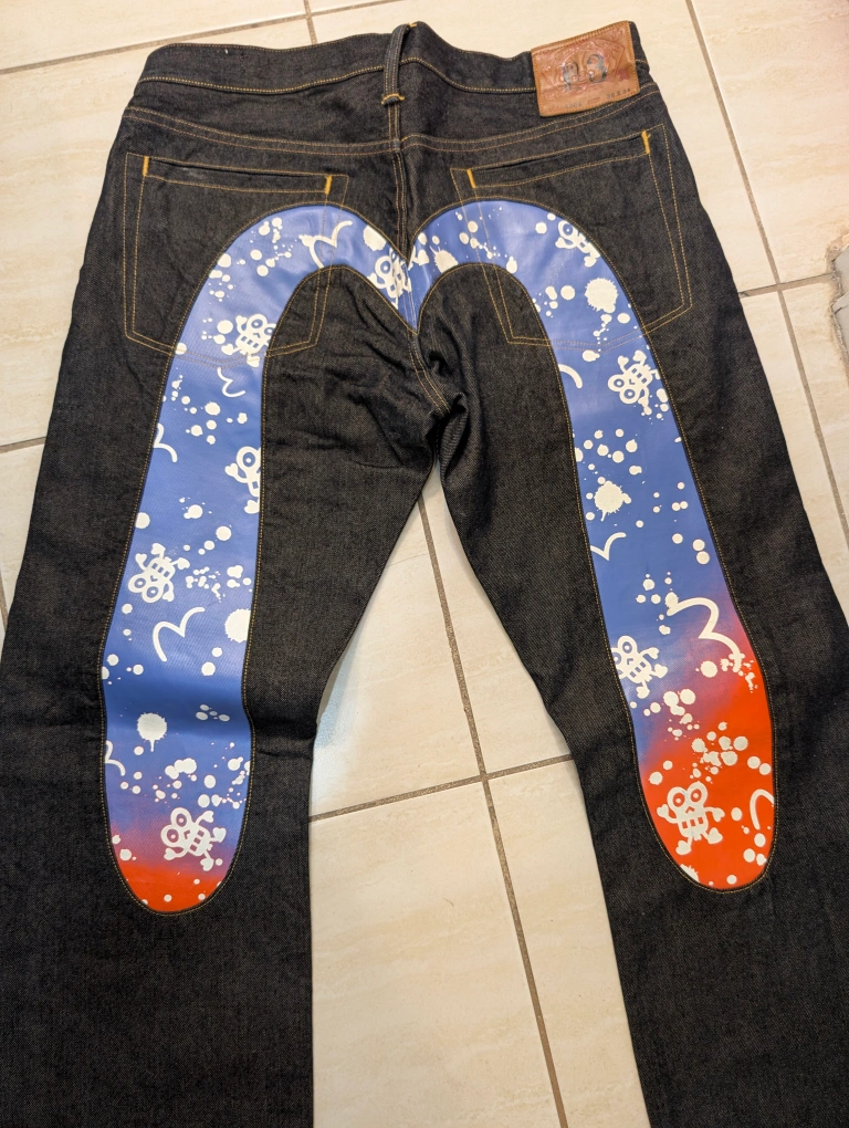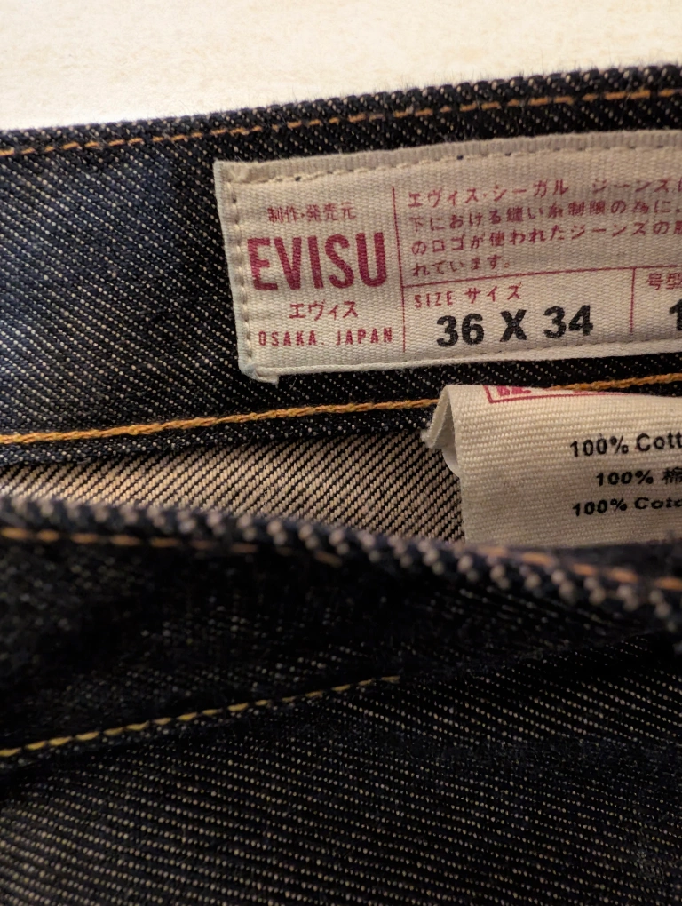 EVISU jeans available in size 36 x 34! These jeans feature a unique design on the back pockets. They are in great condition and ready for a new home