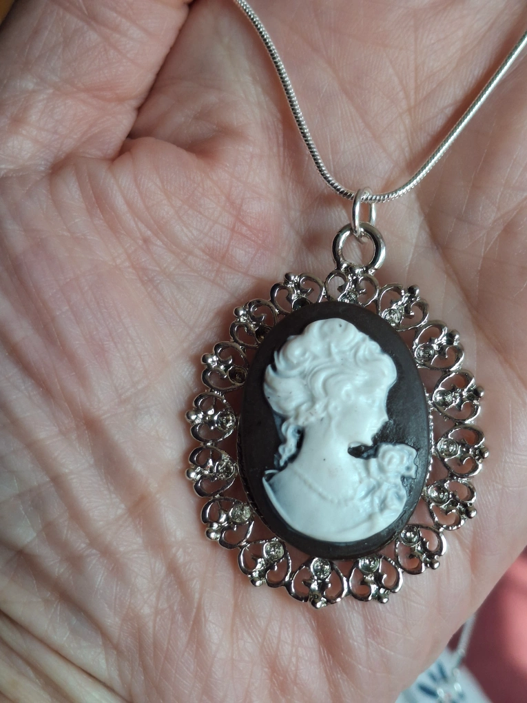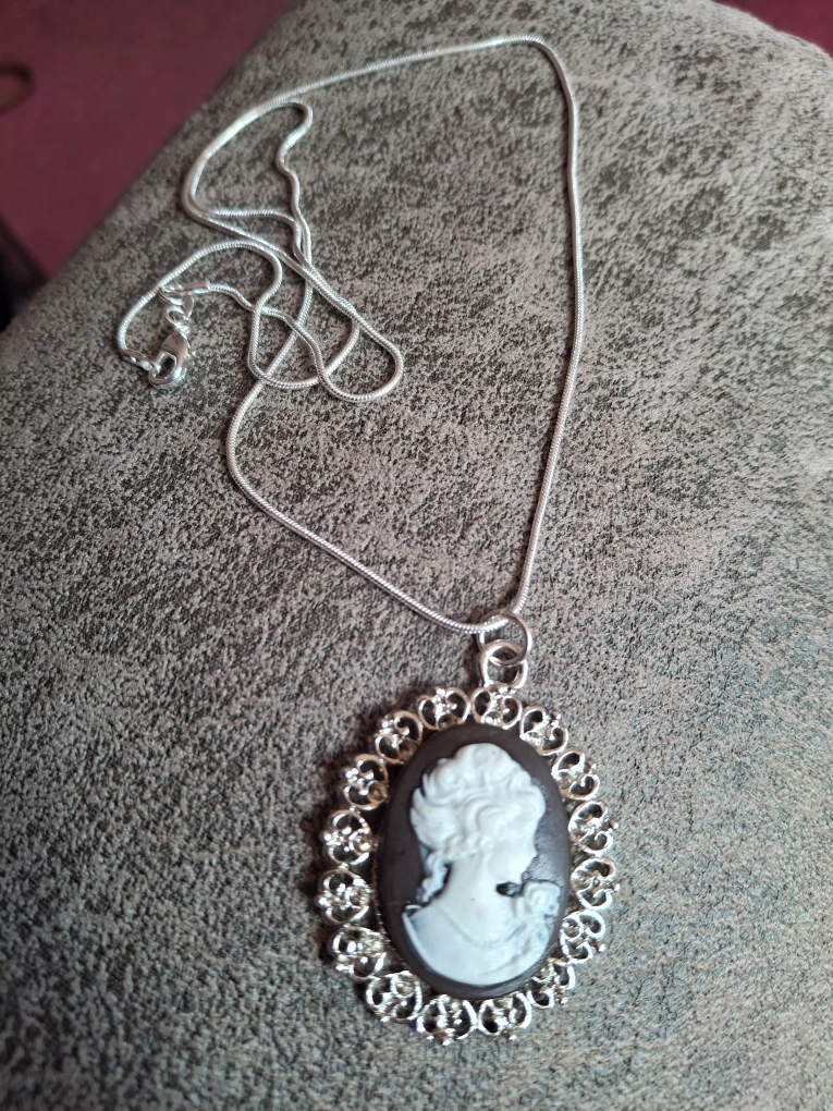 A lovely cameo pendant necklace! It features a classic cameo design with a silver plated chain and ornate detailing around the oval pendant. It would make a great addition to any jewelry collection