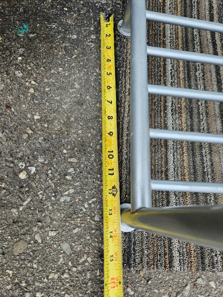 Here's a handy silver metal shoe rack! It measures approximately 34 inches in length, 15 inches in width, and 16 inches in height. Perfect for keeping your entryway tidy and organized